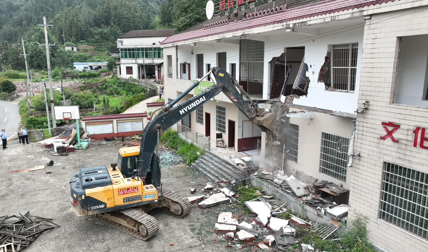 在各拆迁现场,工作人员提前拉起警戒线,劝导无关人员远离施工区域,同时逐一对待拆房屋进行细致检查,将屋内残留物品搬运至指定存放点;专业技术人员则精准操作,有序拆除电表、切断连接电杆的电线与通讯线路,全面消除施工安全隐患。待确认房屋内无人、周边无安全风险后,挖掘机驾驶员操控机械臂逐步拆解房屋,整个流程高效且安全。