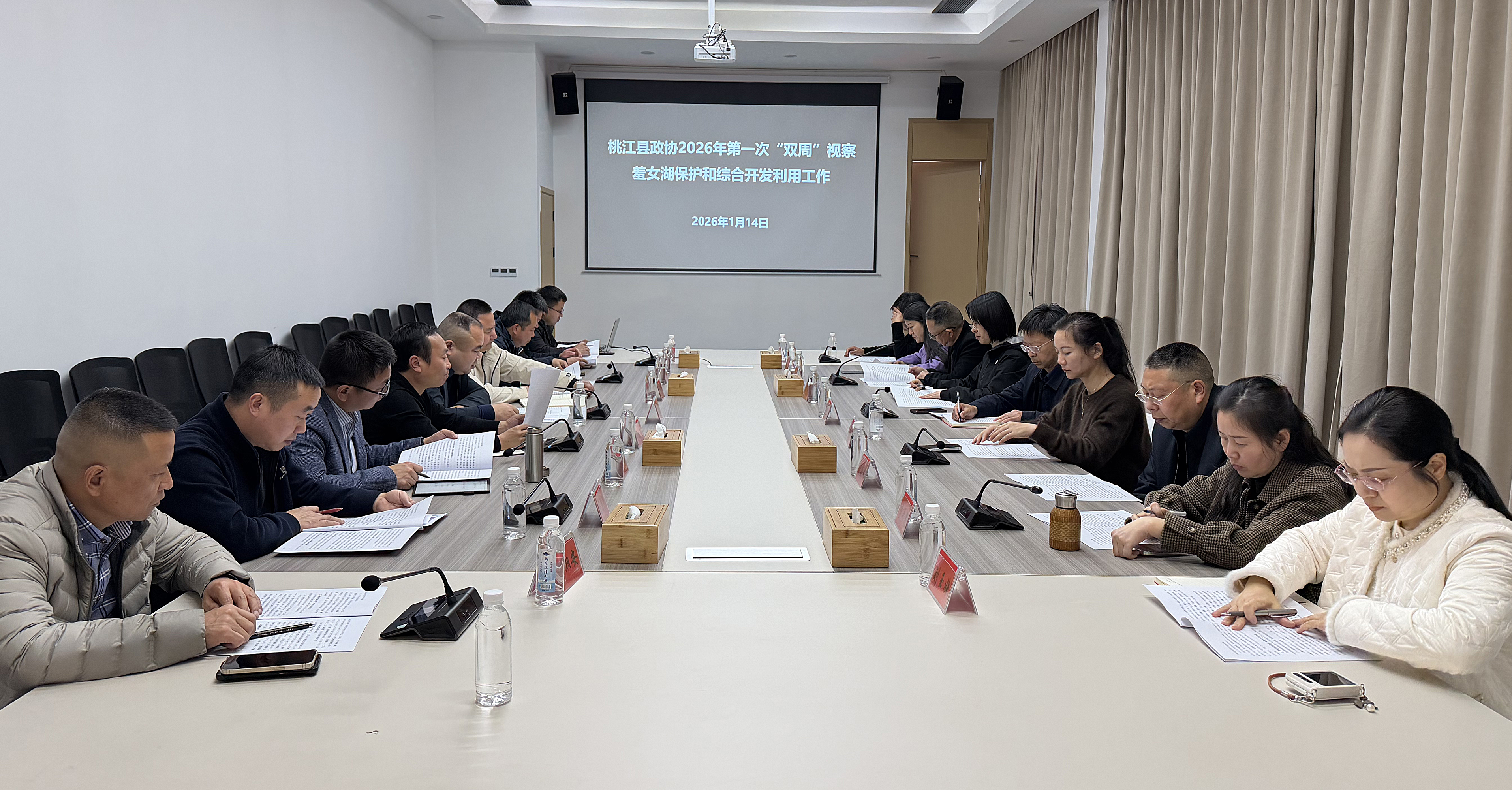 1月14日下午,县政协组织开展2026年首次“双周”视察活动,聚焦羞女湖国家湿地公园的保护与综合开发利用工作。县政协主席杨凯波率队视察,副县长龚胜芳、曹玉玲应邀参加。