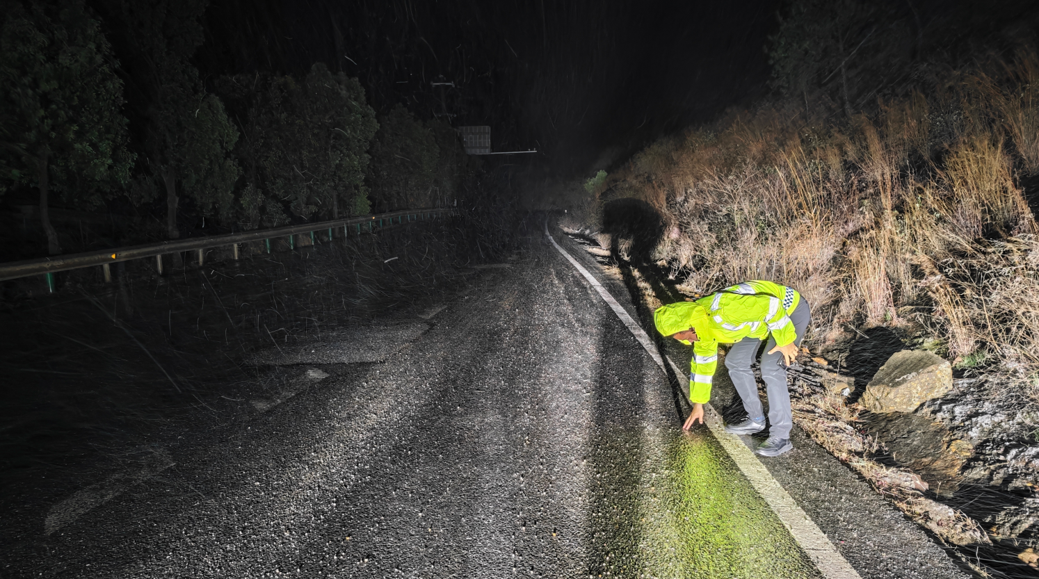 1月19日晚,灰山港镇平安法治和应急管理办、交警中队等在雪峰山水库上坡处查看路面结冰情况 灰山港镇 供图