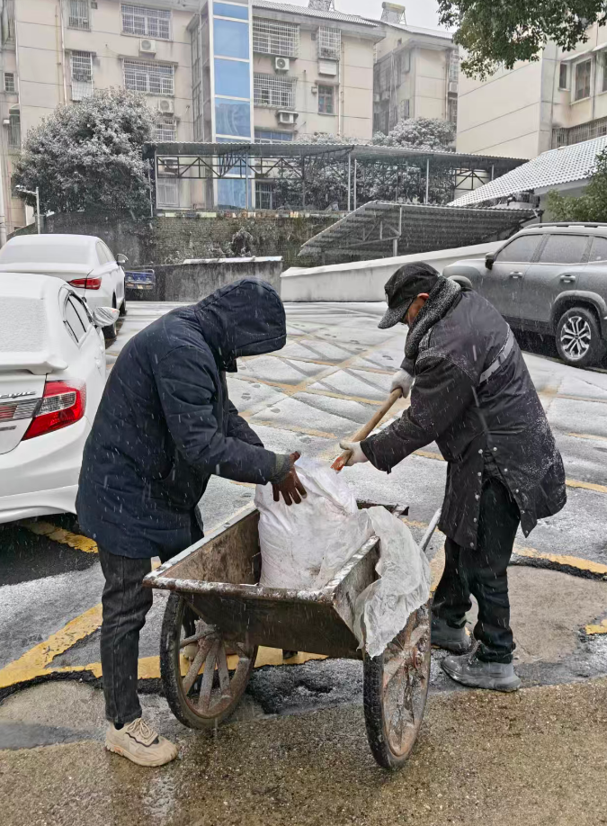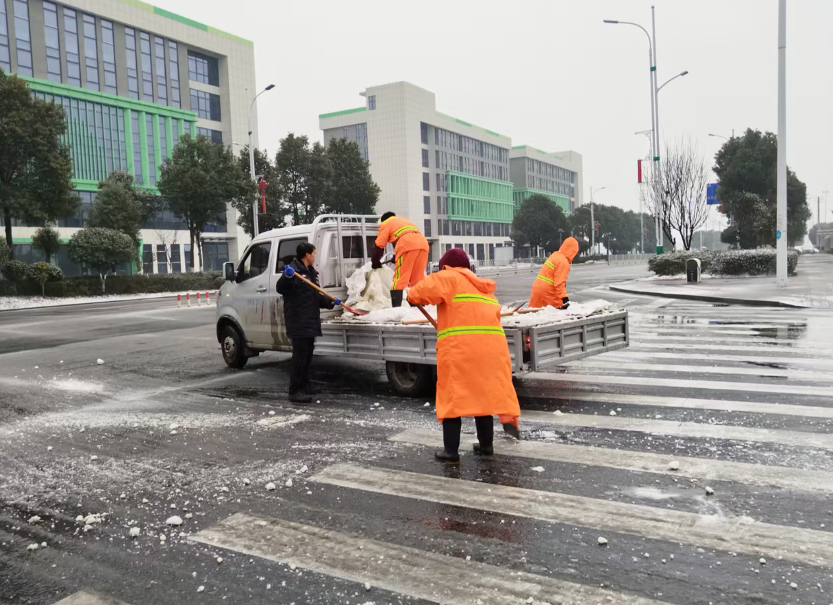 县竹乡公司联合物业公司对园区内道路进行撒盐破冰除雪行动,全力保障园区企业安全生产