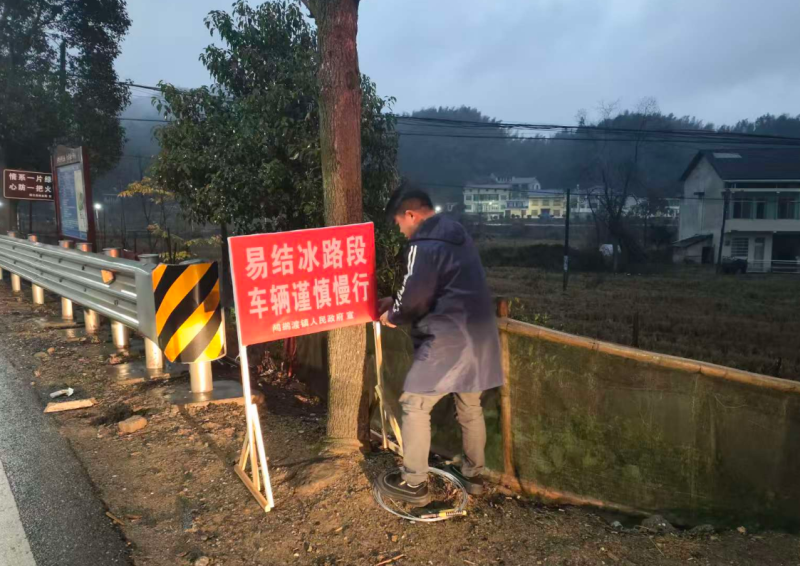 1月19日晚,灰山港镇平安法治办、应急管理办、交警中队等在神仙坳设置警示提示牌 灰山港镇 供图