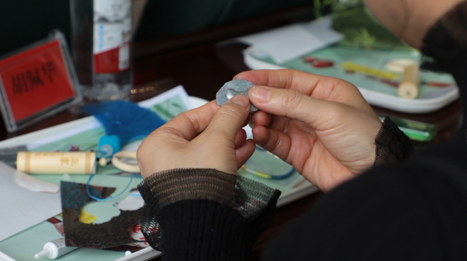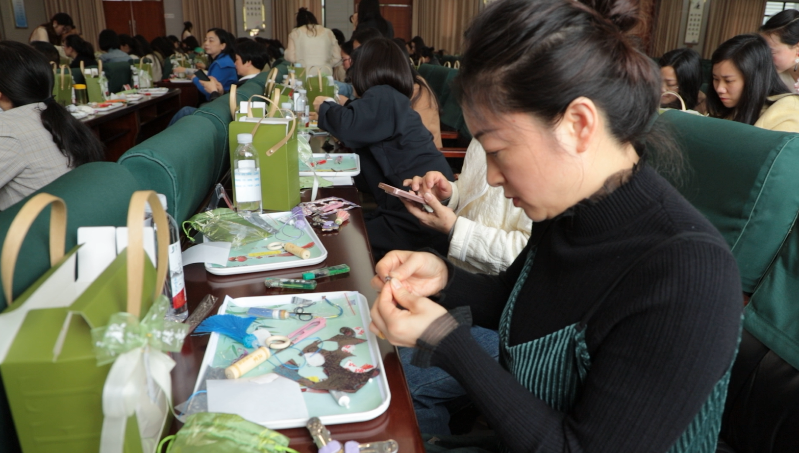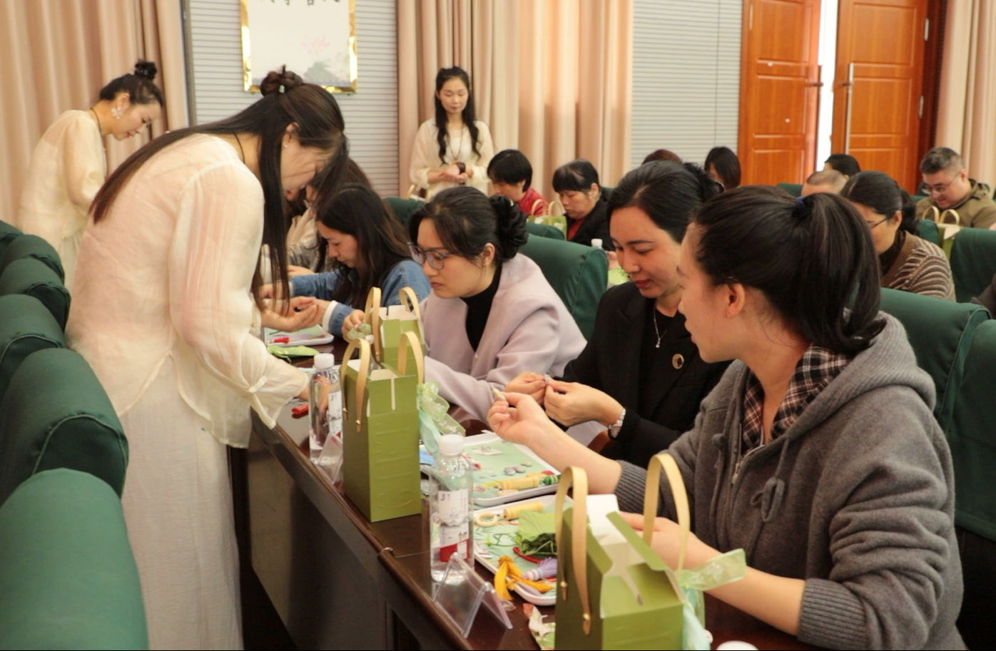 在随后的“廉心巧作 清风同行”手工廉礼制作环节,老师铺开宋锦与竹刻工具,细致讲解制作流程;家属们跟着步骤细心操作,精心挑选纹样、拼接宋锦、悬挂竹刻。现场氛围专注而热烈。