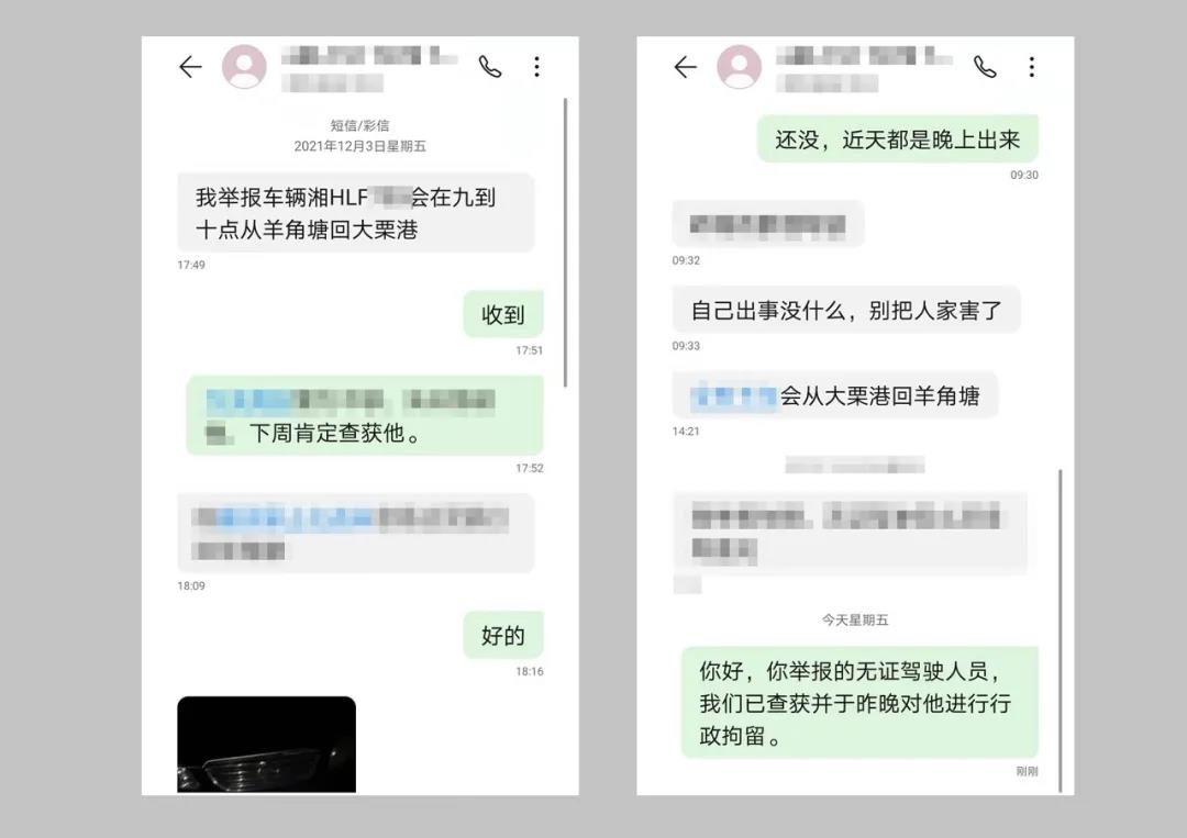 “你好,你举报的无证驾驶人员,我们已查获并于昨晚对他进行行政拘留。” 1月7日一大早,马迹塘交警中队中队长邓跃红向此前提供举报线索的群众发送了一条信息。