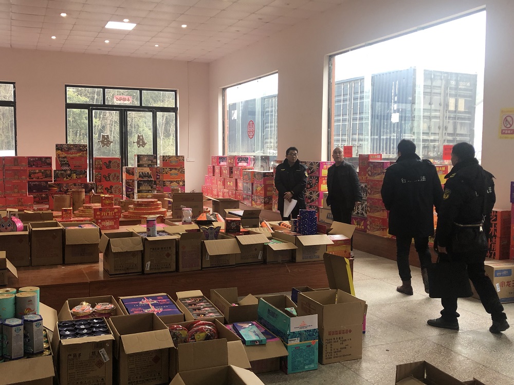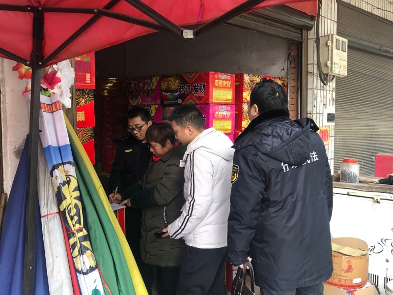 执法人员在高桥镇随机抽查烟花爆竹零售店