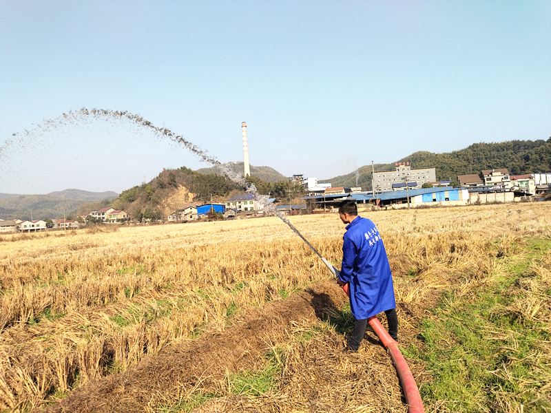 1月29日,大年初八,湖南大队长农业有限公司进入复工复产的第二天。在武潭镇新铺子村,该公司的员工早就在田里忙开了。只见机耕道上一字排开停放着3辆粪肥运输车,大队长农业公司的员工把输送管道拖到田中,拧开开关,一股浓黑的沼液从几位操作员手中的高压喷枪里喷射而出,冲开十多米远。接着,操作员们不断变换姿势,把沼液均匀地洒施到田里的每一个角落。