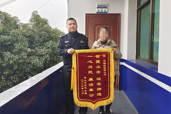 近日,鸬鹚渡镇居民习女士前往当地派出所,将一面印有“雷霆出击 破案神速 一心为民 廉洁奉公”的锦旗送到民警手中,感谢他们为其追回全部被骗现金。