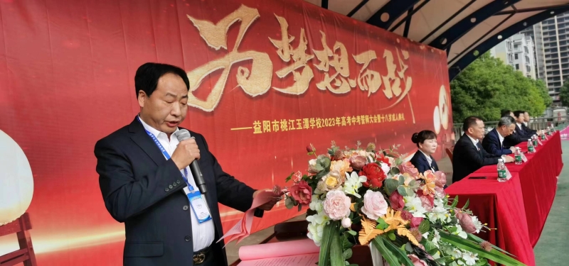 桃江玉潭学校总校长曾自强做了题为《立宏志奋发图强   创佳绩不负韶华》的讲话。他希望广大高三学子要用更多的行动诠释“青春的光辉”,用更多的奋斗握紧“理想的钥匙”,将爱国、担当、奋进、自强当成自己最厚重的底色、最醒目的注脚;希望大家更要有闻鸡起舞、强国报国的志气,挑战自我、横刀立马的勇气,敢于亮剑、永不言败的霸气,笑傲六月、舍我其谁的豪气,趁阳光正好、青春正盛、志气正高、芳华正美,打赢中考、高考的战役。