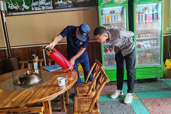 消防宣传员对九小场所经营者进行灭火器知识宣讲 吴玲 摄