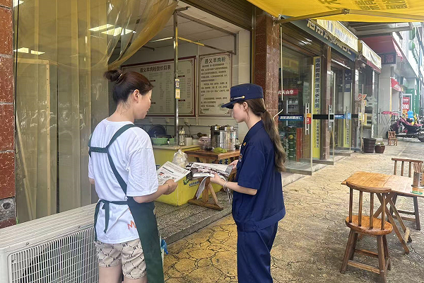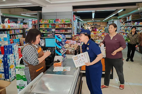 消防宣传员对九小场所进行消防知识宣传 吴玲 摄