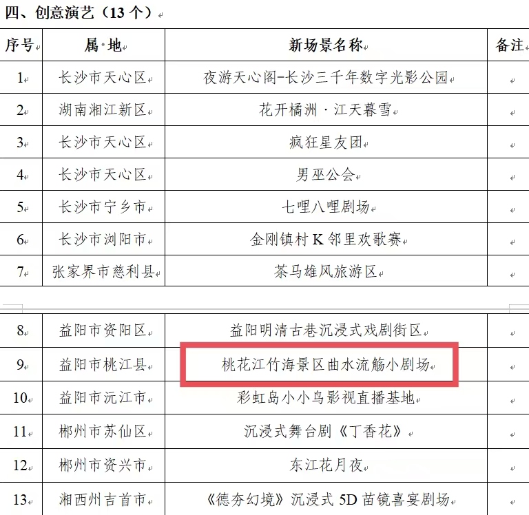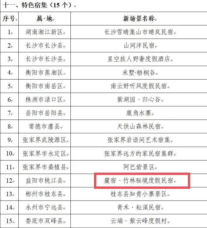 根据《湖南省文化和旅游厅关于做好第三批湖南文旅消费“新生代·新场景”遴选推荐工作的通知》要求,经自愿申报,市州文化和旅游部门推荐,专家评审,省文化和旅游厅审议等程序,9月16日,桃花江竹海景区曲水流觞小剧场、桃江县罗溪森林康养基地、益阳市羞女湖旅居度假营地、麓宿·竹林秘境度假民宿4个优质文旅项目成功入选第三批湖南文旅消费“新生代·新场景”名单。