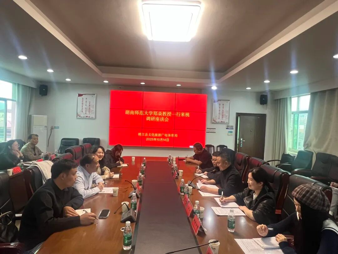 随后召开的座谈会上,县文旅广体局党组书记、局长吴建平系统介绍了桃江县文旅资源的概况与产业发展现状。郑焱教授团队结合考察所见,对桃江文旅项目的特色与成果给予了肯定,并就业态创新、品牌提升与发展路径等议题,与在场的县局代表、乡镇分管领导及企业负责人交换了意见。