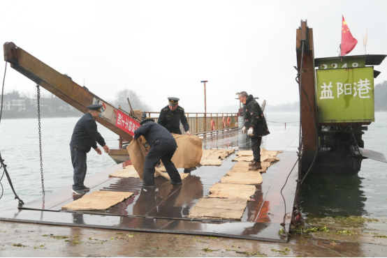 为应对本轮低温冰雪天气,1月19日下午,县交通运输局组织交通运输综合行政执法大队一中队与水运事务中心工作人员,分成两个小组,为资水桃江段54处渡口的52艘渡船统一铺设防滑麻袋,全力保障水上交通安全。