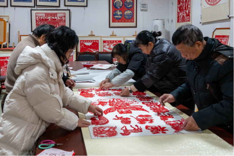 老中青三代剪纸艺人正在创作“百骏呈祥” 薛雅琴 摄