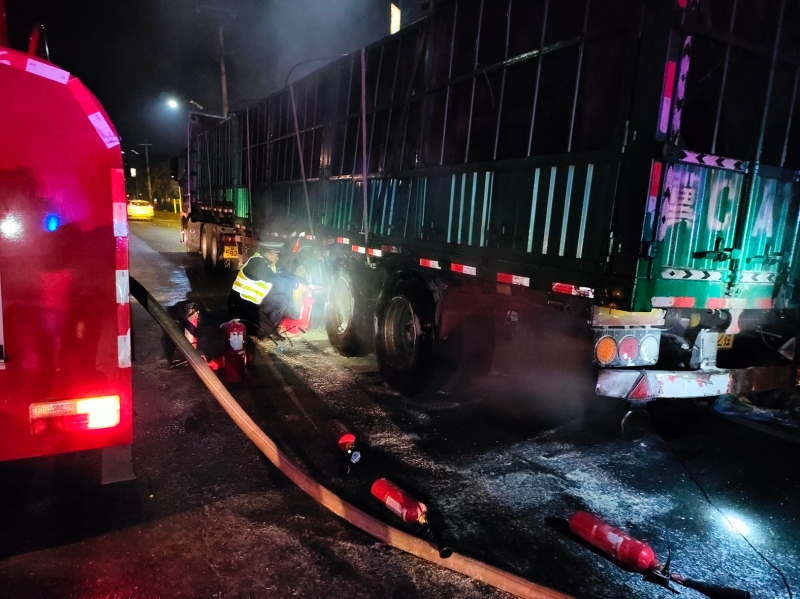 得知这一重大安全隐患后,民辅警与当地镇政府、派出所、以及高速交警、消防等部门分工协作,由消防人员压制火势,交警、派出所、高速交警对事发路段实施全面临时交通管控,快速划定警戒区域,疏散周边无关人员与车辆,严禁火源靠近,全力开辟安全救援通道,严防爆炸、火灾等次生事故发生。