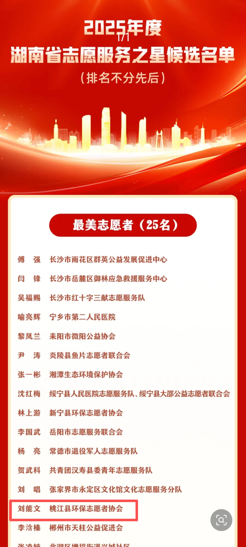 2月25日,湖南省委社会工作部发布2025年度湖南省“志愿服务之星”拟定名单。桃江县环保志愿者协会洋泉湾分会志愿者刘能文光荣上榜,荣获“最美志愿者”称号,成为本年度益阳市唯一获此殊荣的志愿者。