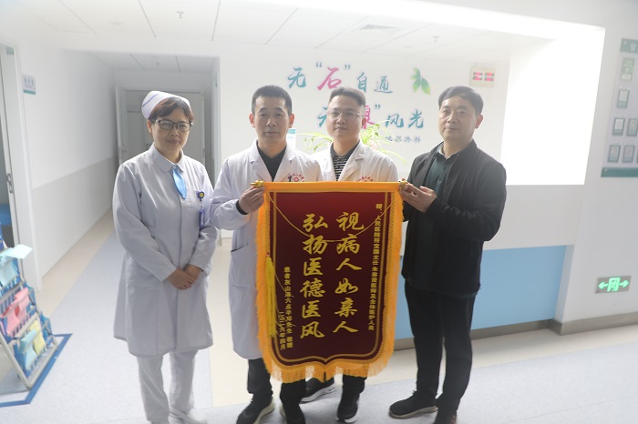 4月16日,患者邓海滨将锦旗送至桃江县人民医院泌尿外科科室,感谢医护团队用精湛技术为他“卸下”困扰了他6年、辗转求医未果的巨型肾结石。