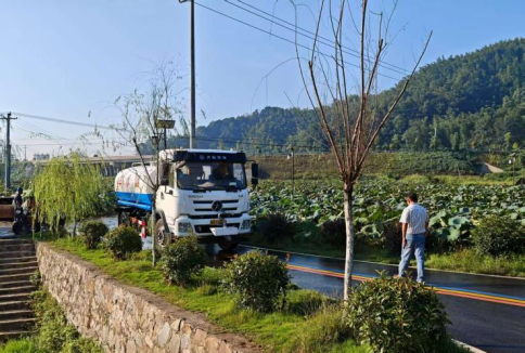 县政协委员、杉树村村民代表薛伟强发动洒水车冲洗美丽屋场路面 周星煜 摄
