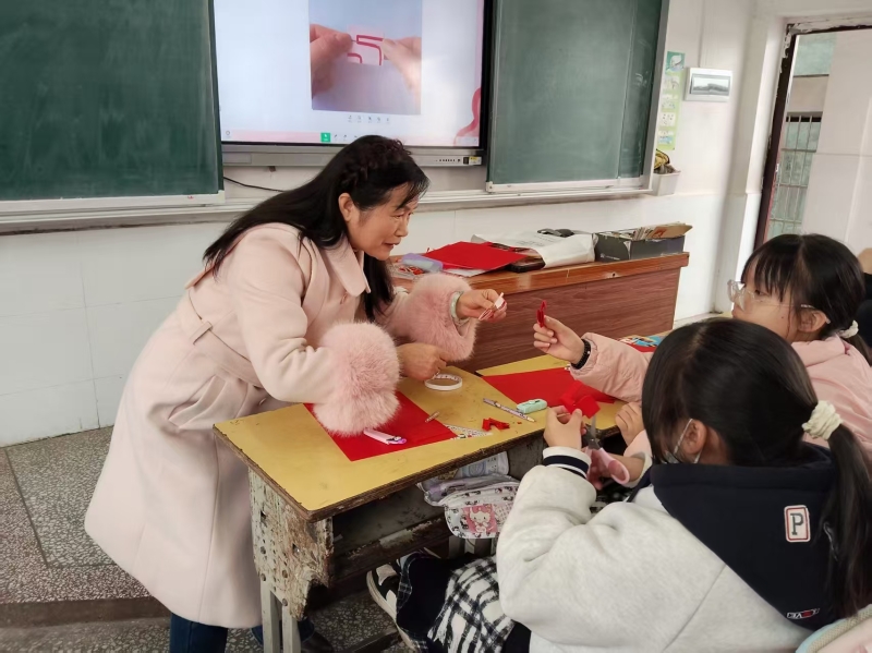 作为剪纸技艺的资深传承者,龙叶红以"对折剪纸"为核心教学内容,从纸张折叠的角度把控、剪刀使用的力度技巧,到图案设计的寓意内涵,进行了层层递进的细致讲解。"先对折两次,边角对齐不能歪,剪曲线的时候要慢一点..."她一边示范一边叮嘱,红纸在剪刀开合间化作简约流畅的线条,转眼就变成了寓意吉祥的"囍"字、栩栩如生的小花。在老师的耐心指导下,学生们纷纷拿起工具动手尝试,从最初的生疏犹豫到逐渐熟练上手,专注的眼神里满是对传统技艺的好奇与热爱。当一张张亲手制作的剪纸作品被高高举起时,教室里洋溢着满满的成就感,欢声笑语中定格下非遗传承的温暖瞬间。
