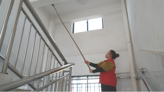 清扫楼梯口的蜘蛛网 邓宇婷 摄