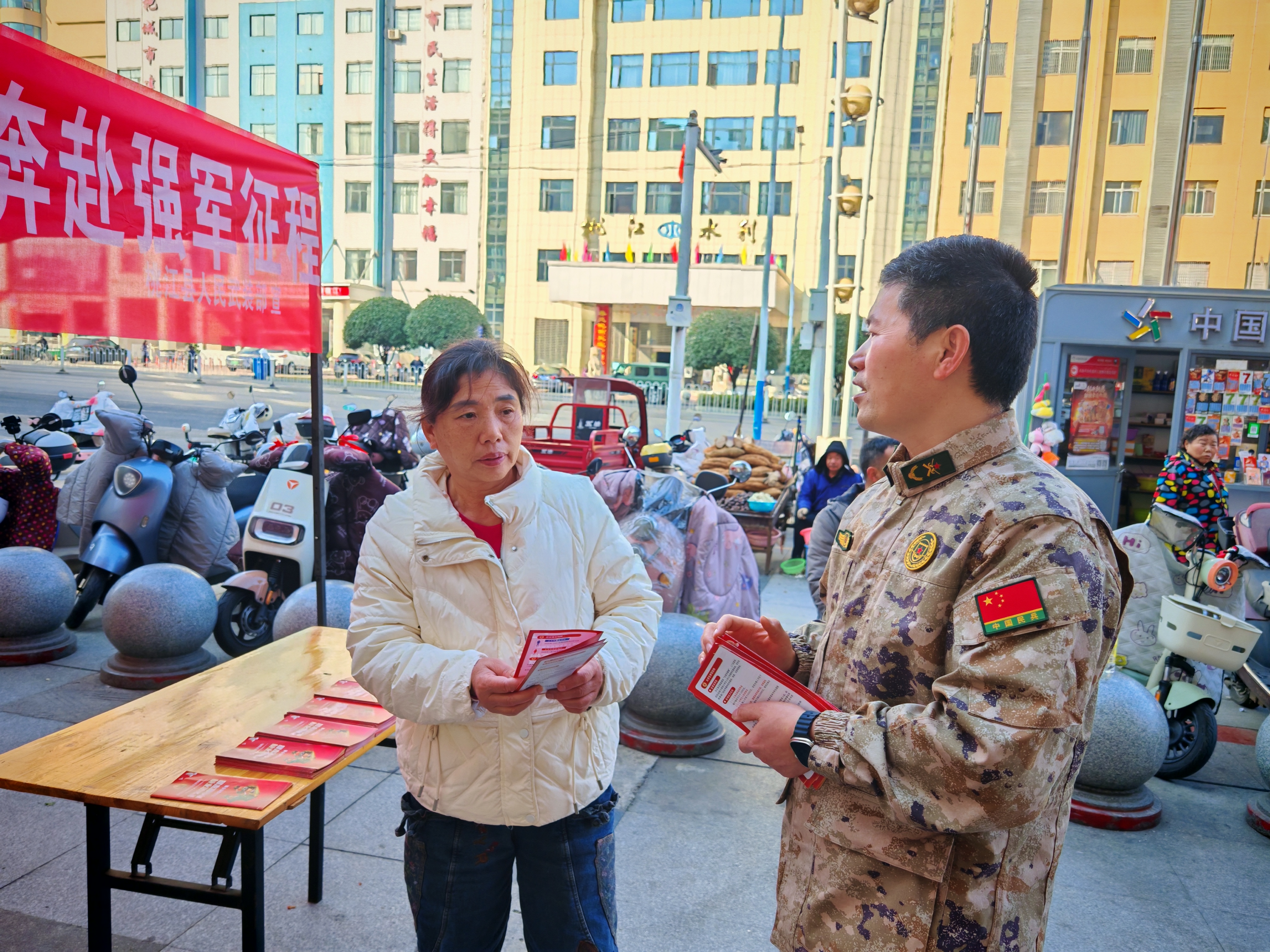 镇武装部工作人员在人流密集区域搭建宣传咨询台,一边向过往行人发放宣传材料,一边面对面讲解2026年春季征兵的报名条件、网上报名流程、体检政审要求,重点解读了大学生入伍学费补偿、地方优抚补助、退役后就业安置及考研升学优惠等群众关心的利好政策。