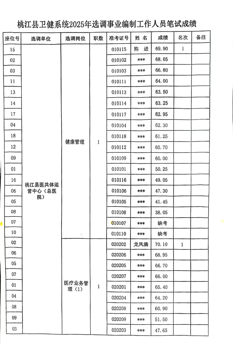 桃江县卫生健康系统2025年选调事业编制工作人员笔试阅卷工作已于日前结束,现将笔试成绩予以公示。对成绩有异议者,请于2025年9月30日下午18:00前(正常上班时间)持本人身份证和准考证原件及复印件到桃江县人力资源和社会保障局事业单位管理股(联系电话:0737-8883697)提出查分申请,逾期不予受理。
