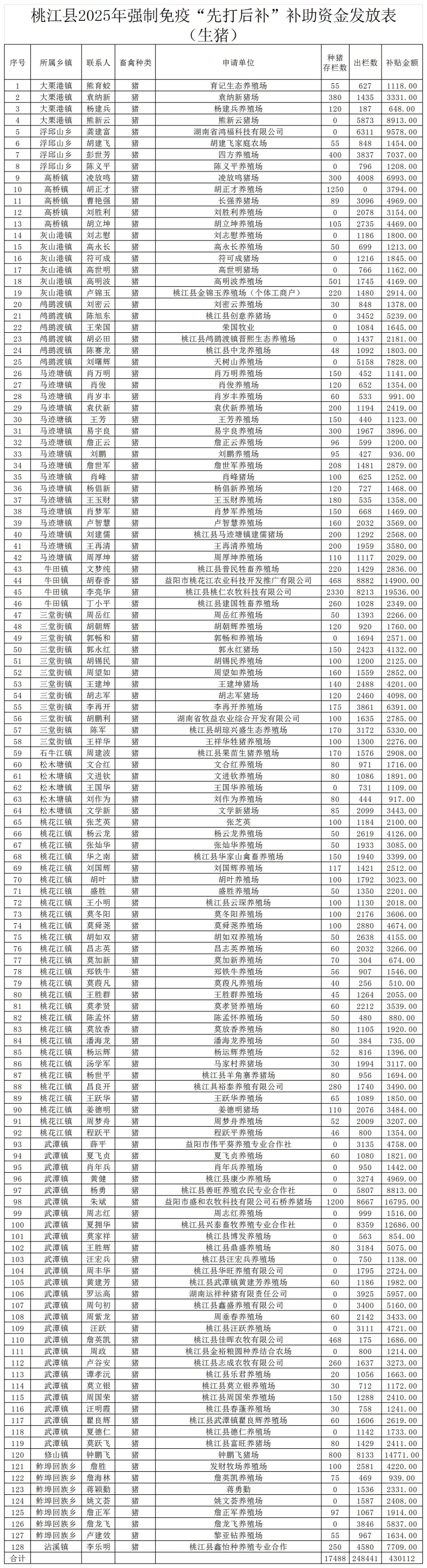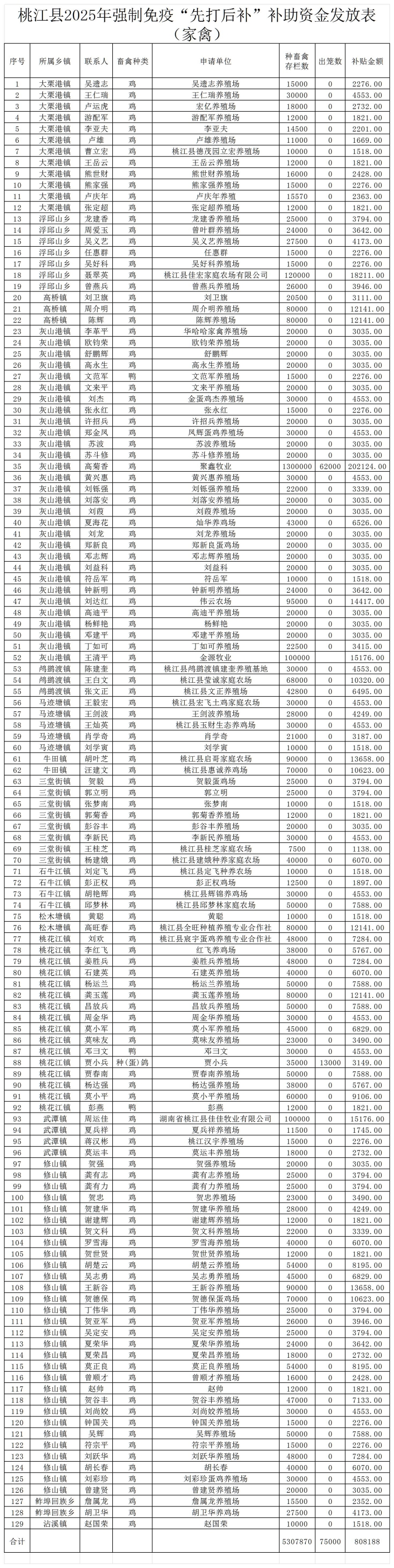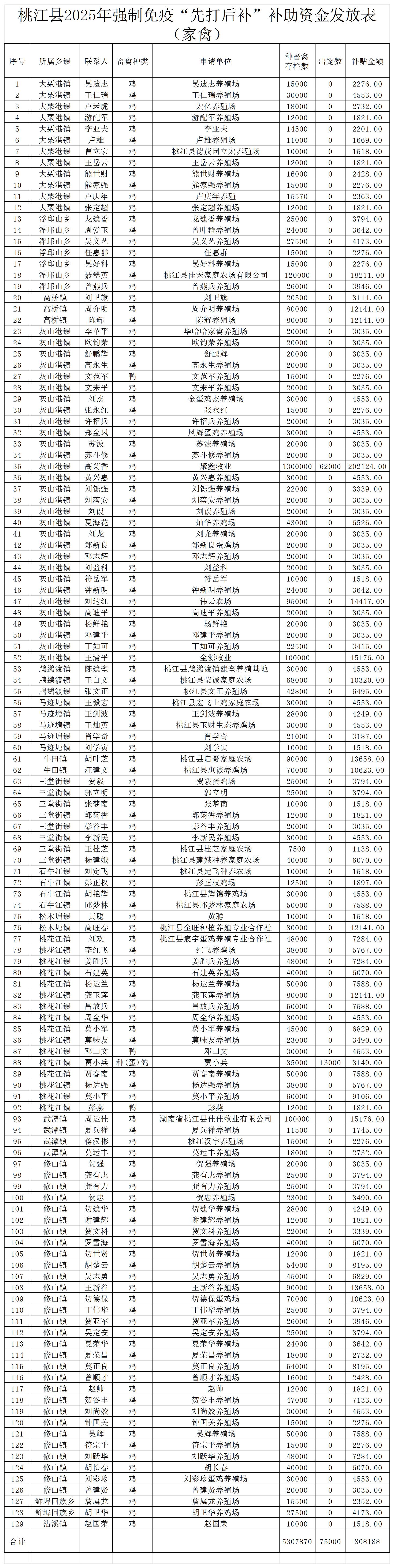 附件2:桃江县2025年强制免疫“先打后补”补助资金发放表(生猪、禽类明细表各一张)