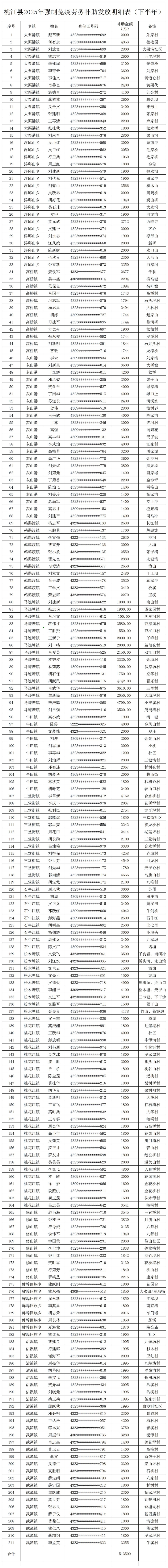 附件1:桃江县2025年强制免疫劳务补助发放明细表(下半年)