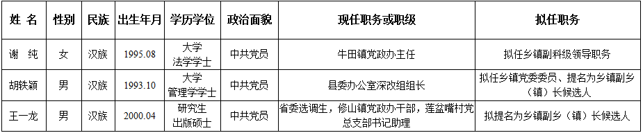 为了加强对干部选拔任用工作的监督,提高识别和任用干部的准确程度,现对县委常委会会议研究决定的拟任职人选进行任前公示。