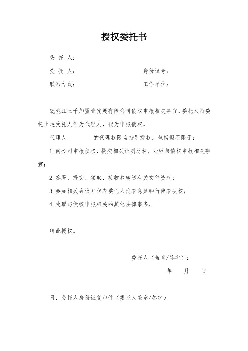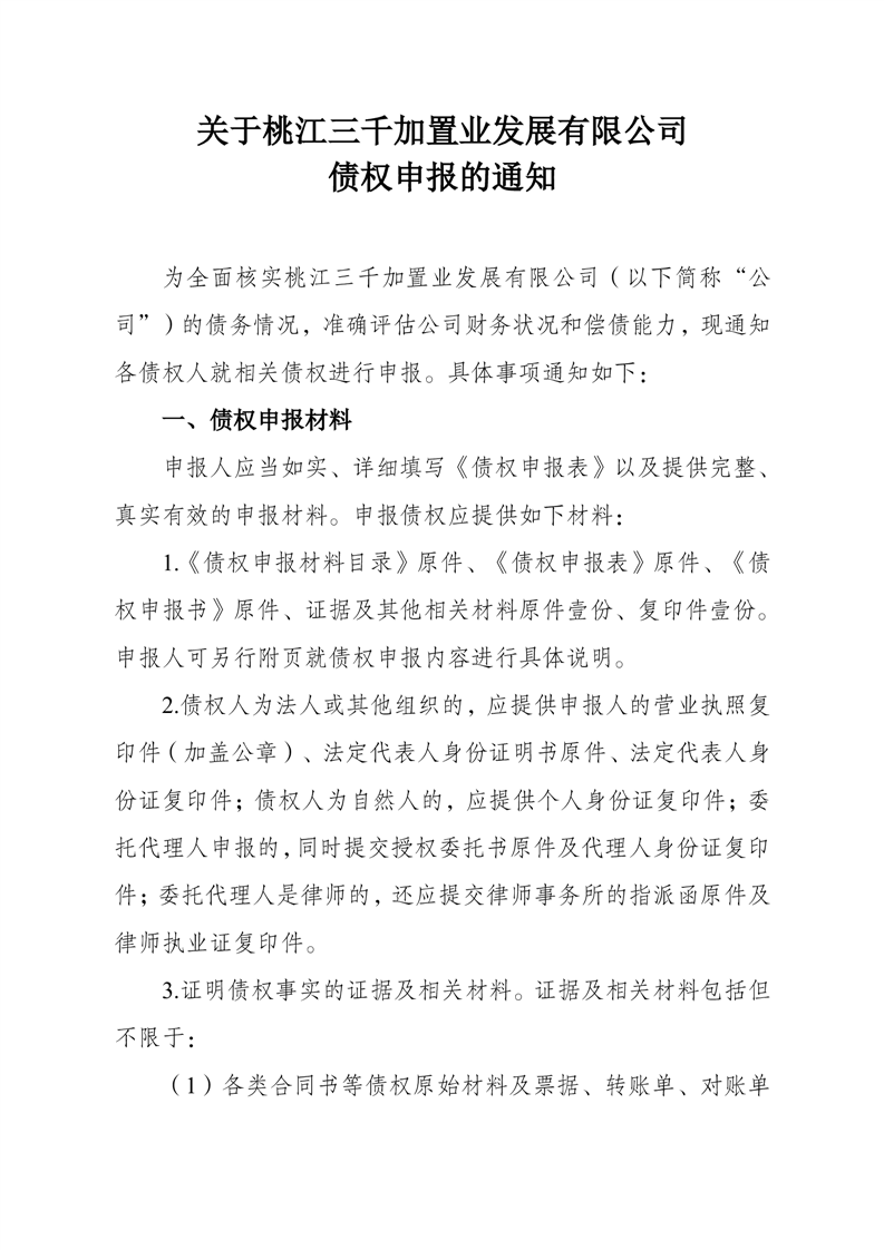 关于桃江三千加置业发展有限公司债权申报的通知