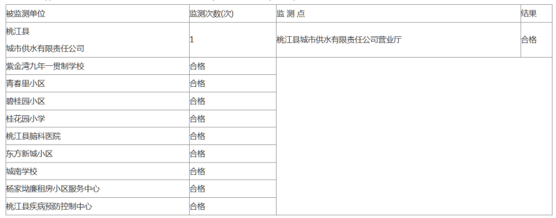 根据《水污染防治行动计划》(国发〔2015〕17号)要求,2025年12月10日,桃江县卫健局组织县疾控中心对我县城市供水有限责任公司下属一水厂、二水厂供应的城市管网末梢水水质情况进行了抽检。现将检测情况公示如下: