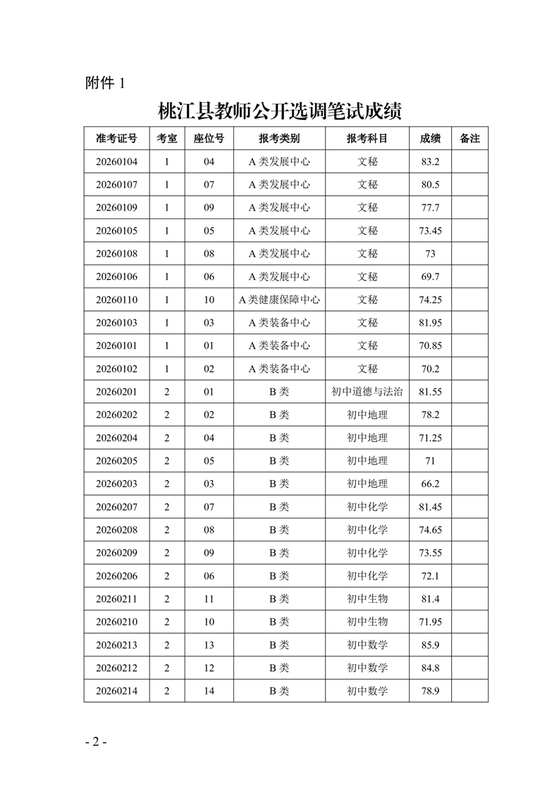 桃江县教师公开选调考试已于2026年1月31日完成,现将成绩予以公示。对成绩有异议者,请于2026年2月3日17:30前持本人身份证到桃江县教育局人事股(桃花江镇资江北路38号5B02室)提出查分书面申请,逾期不予受理。
