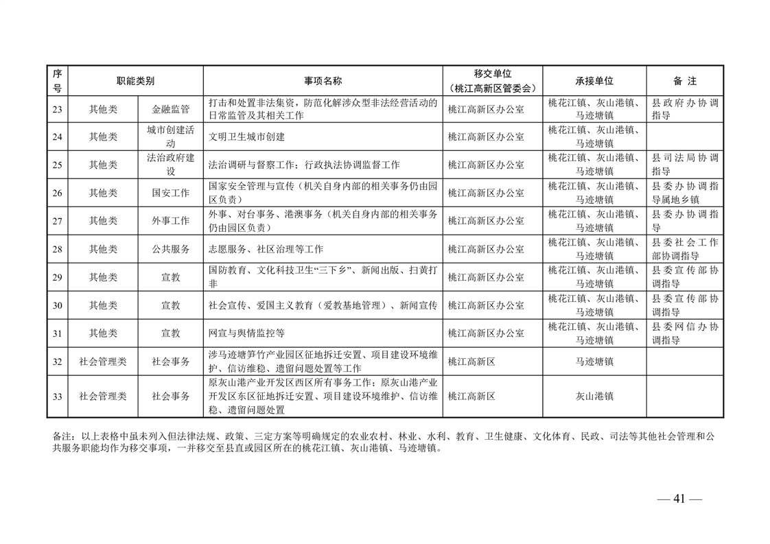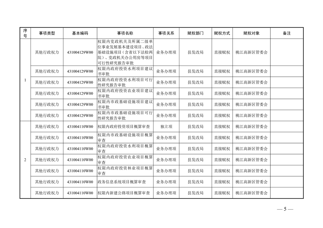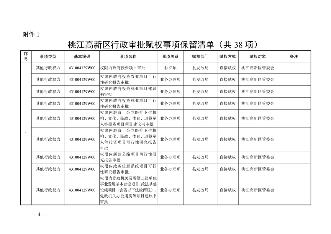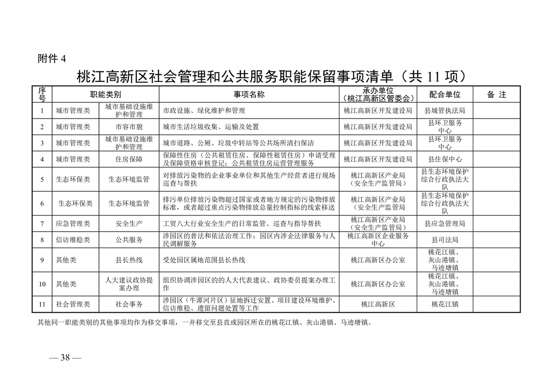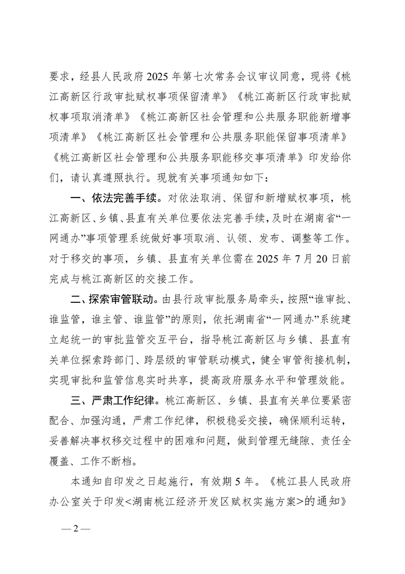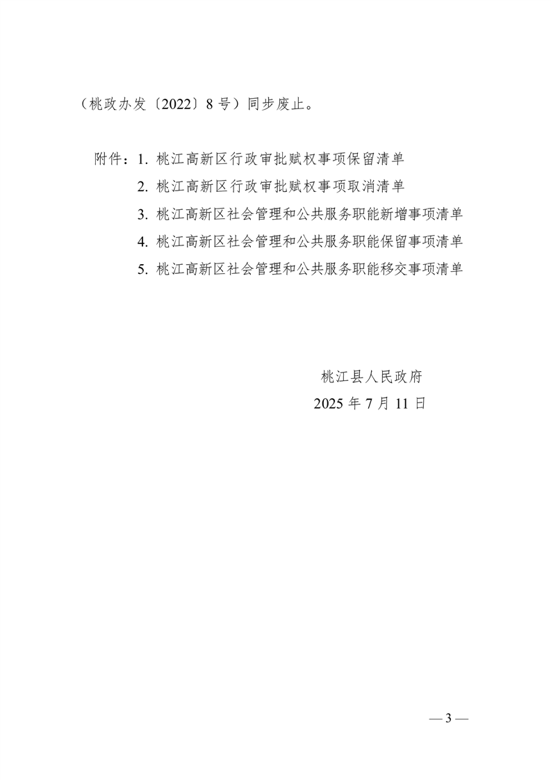 桃江县人民政府 关于印发《桃江高新区行政审批赋权事项保留清单》《桃江高新区行政审批赋权事项取消清单》《桃江高新区社会管理和公共服务职能新增事项清单》《桃江高新区社会管理和公共服务职能保留事项清单》《桃江高新区社会管理和公共服务职能移交事项清单》的通知