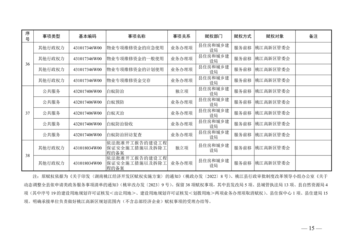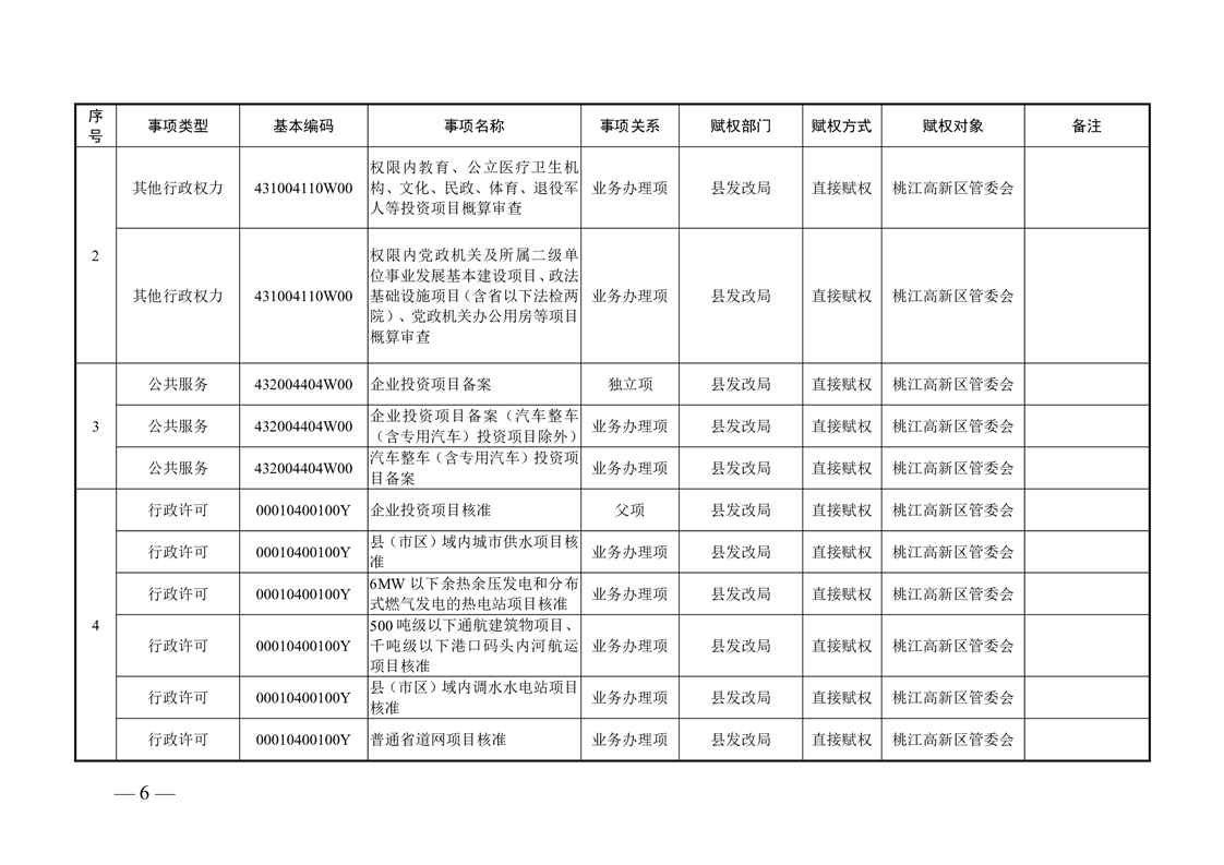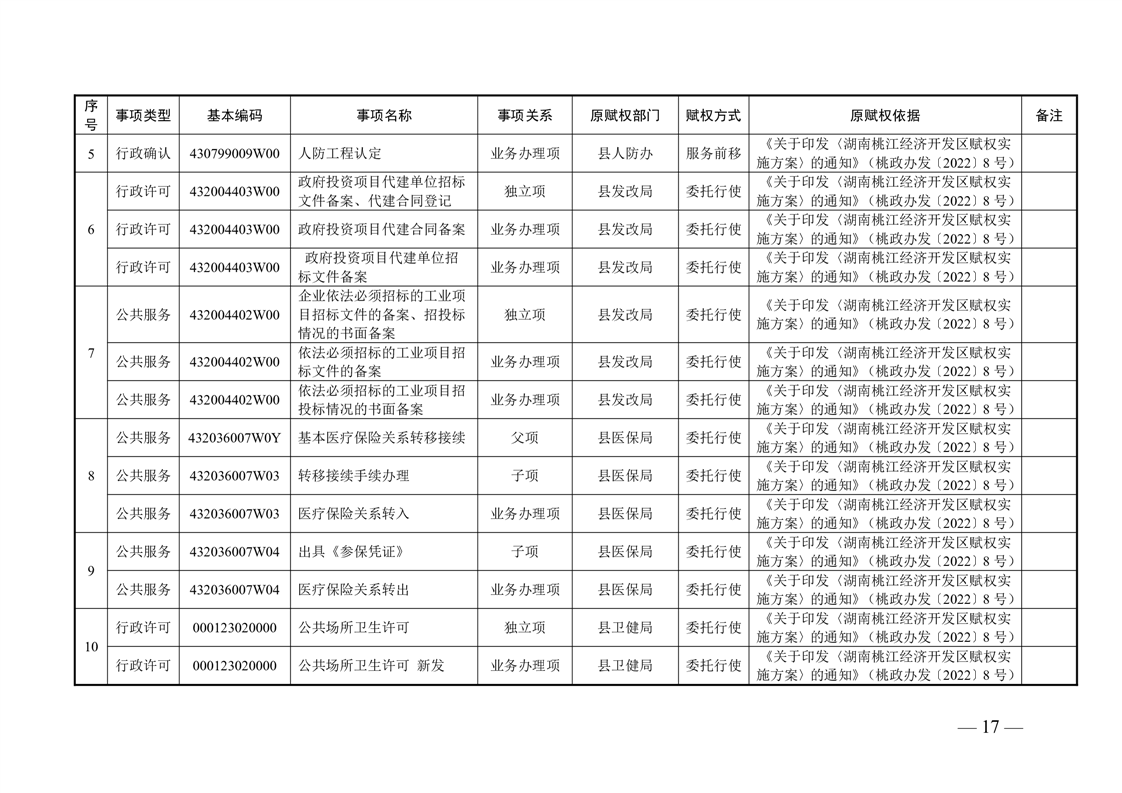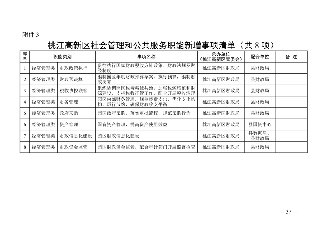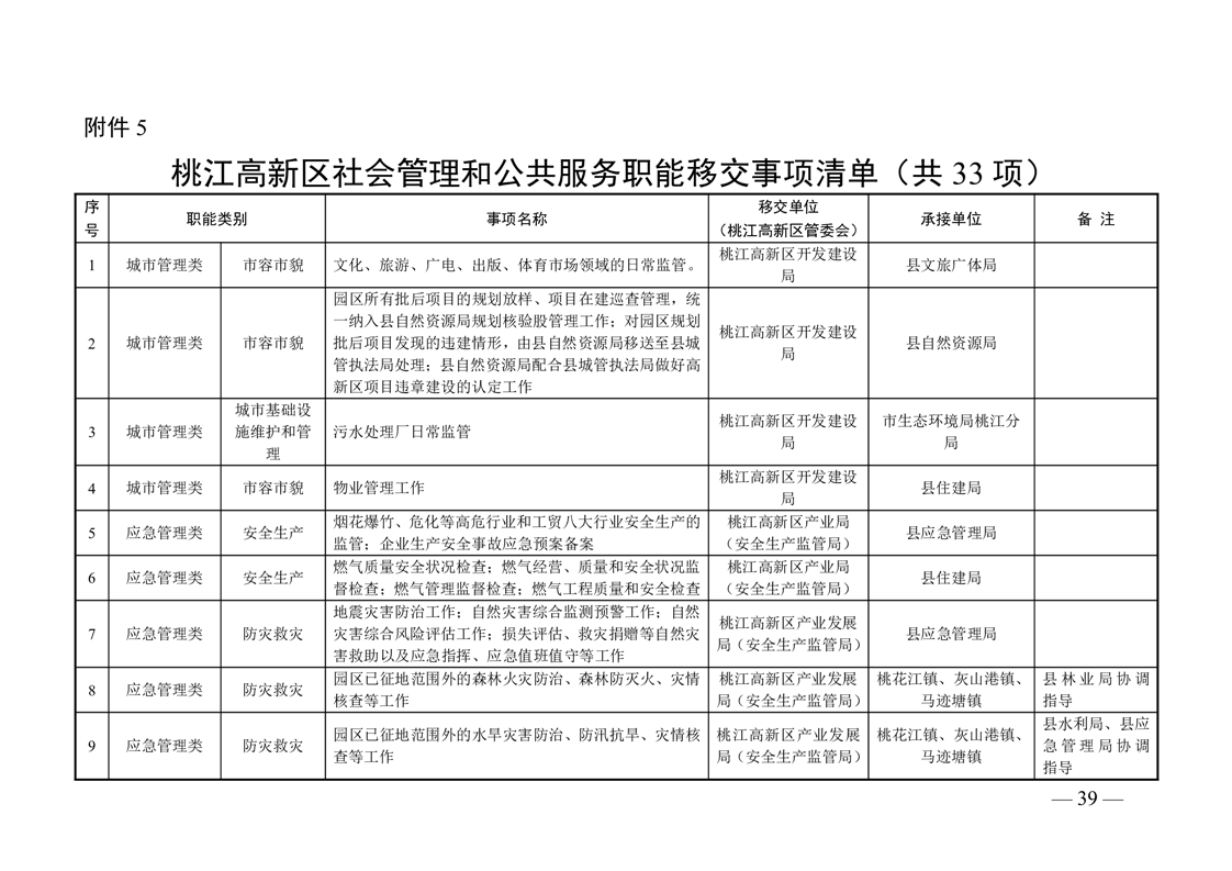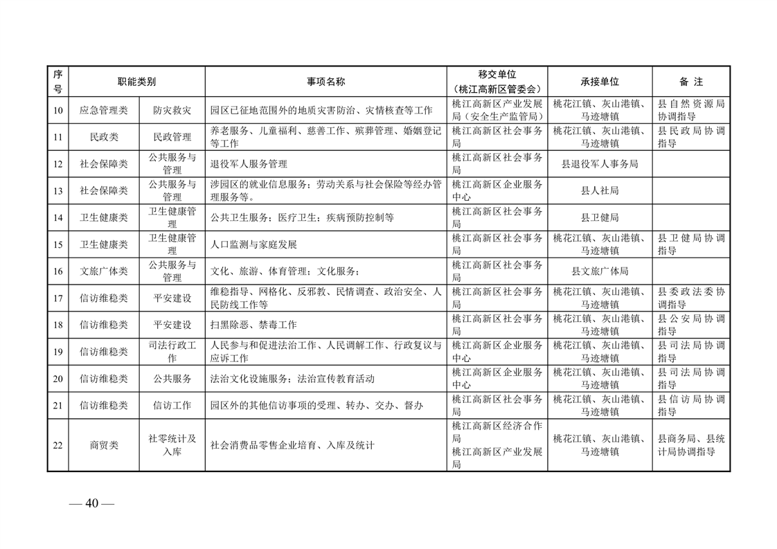 桃江县人民政府 关于印发《桃江高新区行政审批赋权事项保留清单》《桃江高新区行政审批赋权事项取消清单》《桃江高新区社会管理和公共服务职能新增事项清单》《桃江高新区社会管理和公共服务职能保留事项清单》《桃江高新区社会管理和公共服务职能移交事项清单》的通知