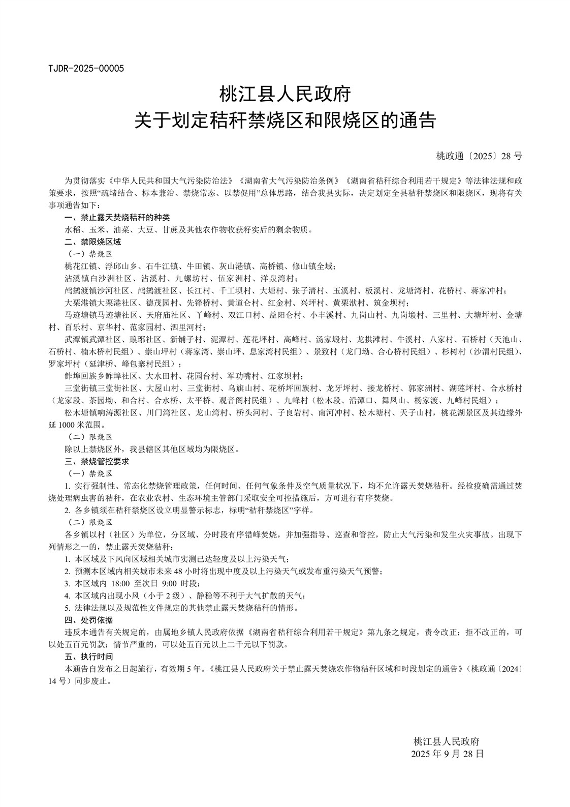 关于划定秸秆禁烧区和限烧区的通告