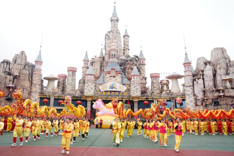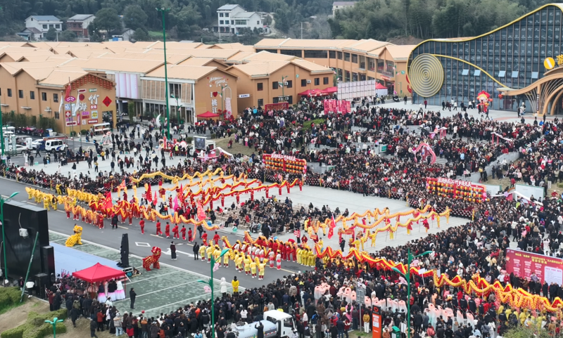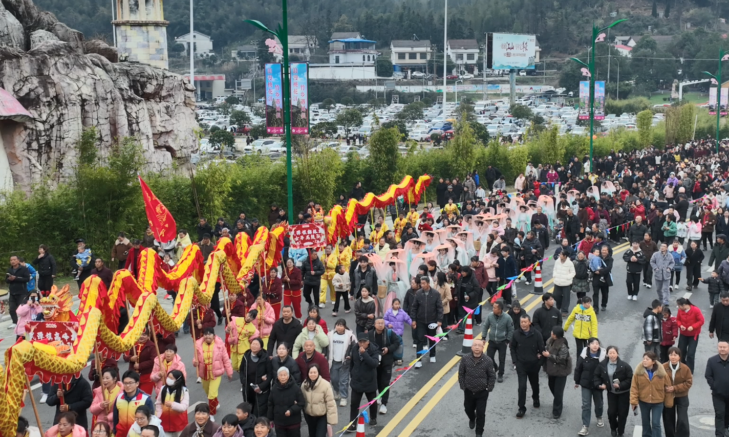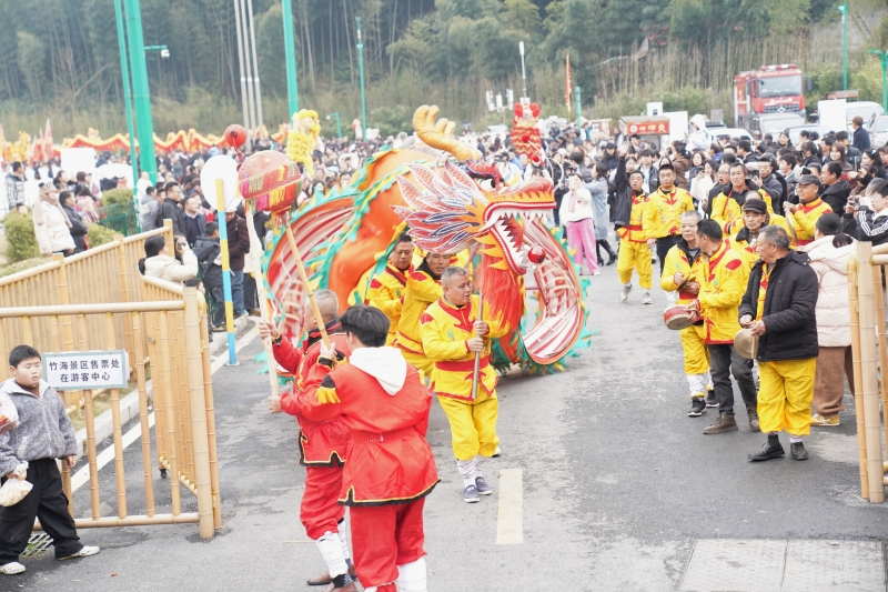 当天下午,伴随着铿锵锣鼓,舞龙表演率先开场,30余条色彩斑斓的长龙翻腾起舞,瞬间点燃现场气氛。随后,“一马当先·百龙呈祥·千人巡游”震撼登场,30多条彩龙组成方阵巡游,古风“桃花美人”、萌趣“元宵宝宝”手捧花灯巡街,笋宝、竹君子、桃仙子等特色IP人偶与群众热情互动。巡游队伍浩浩荡荡穿行景区,沿途市民与游客掌声、喝彩声此起彼伏,处处洋溢着喜庆祥和的节日氛围。