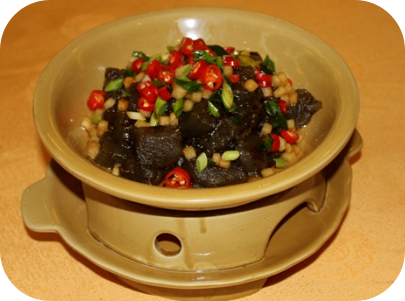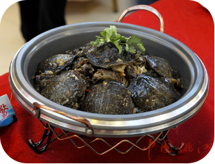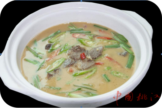桃江沙鳖,取修山柳溪丰沙坝原生鲜活沙鳖,宰杀、去内脏,处理干净后,加料酒、盐、姜片、蒜瓣和土鸡汤用小火煨制而成。味道细嫩鲜香,肥而不腻。含丰富的蛋白质、维生素A、维生素E等微量元素,有抗氧化、抗瘤、抗癌、抗衰老和提高人体免疫力功能等功效,是一道珍贵的补品。据史料记载,桃江沙鳖源出公元前26世纪末,黄帝登熊湘,在修山与南方炎帝实现炎黄联盟,统一华夏举办创立和文化而举行的封禅祭地大典之举,所用祭品为龟、鳖、蛇,其中祭品鳖,就地取材于修山柳溪尾的丰沙坝原生沙鳖。因鳖形状团团圆圆,象征民族大团结之意,至今已有近五千年历史,是桃江最具历史文化背景的名菜。