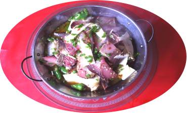 黄牛鞭放入锅中加冷水、姜、八角大火烧形,移至小火煮1小时左右,配青椒、杏鲍菇等调料,把煮好的牛鞭切成菊花状。该菜品鲜香汁浓,富含蛋白质、铜等微量元素,具有补血益气、壮阳壮腰、强筋滋补等功效,是滋补养生的一道美食。