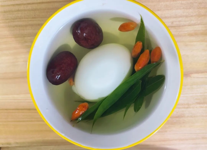 竹叶性寒,味甘、淡,具有清热除烦、生津利尿的功效。红枣补气养血,与鸡蛋、枸杞共同作用,滋阴养血,改善气血不足,有助于调理体质,滋养身心。