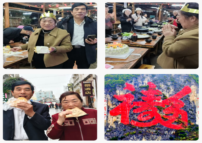 游览一小时后天色已暗,团队赴靖西大酒店,恰逢同行刘腊英60岁生日。晚7:10的演出与晚餐相伴,寿星在生日蛋糕、歌舞与祝福声中感动落泪,现场气氛热烈,其乐融融。