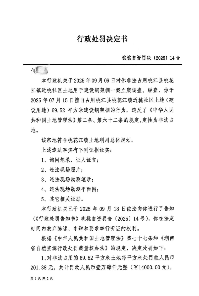 行政处罚决定书 桃桃自资罚决(2025)14号