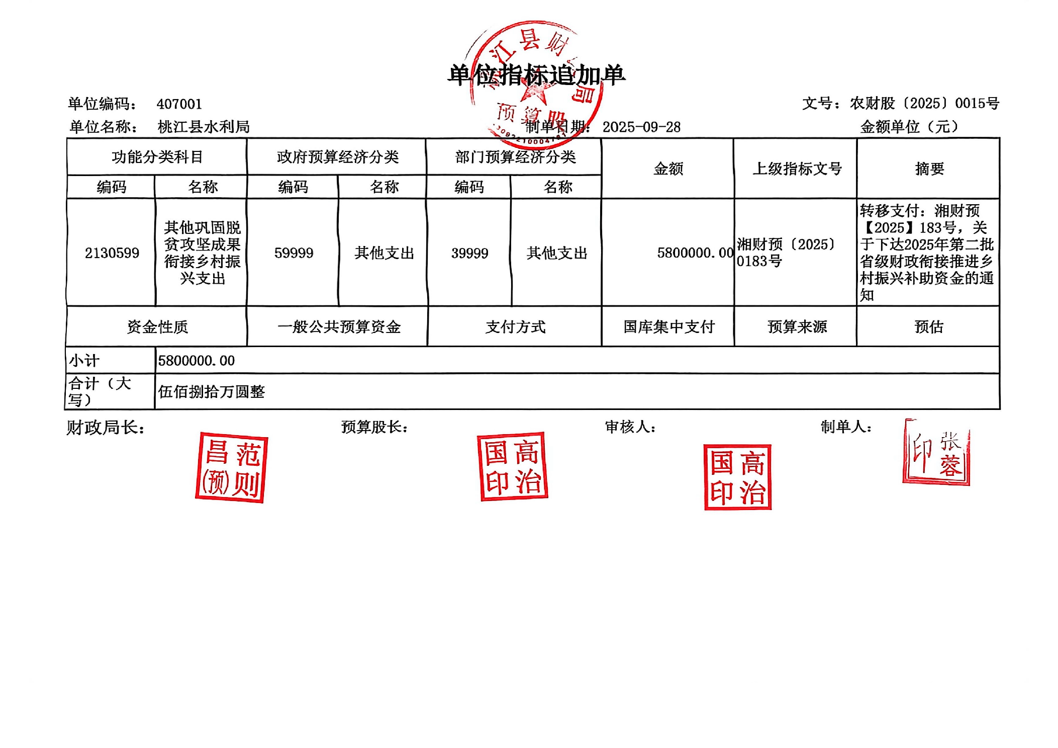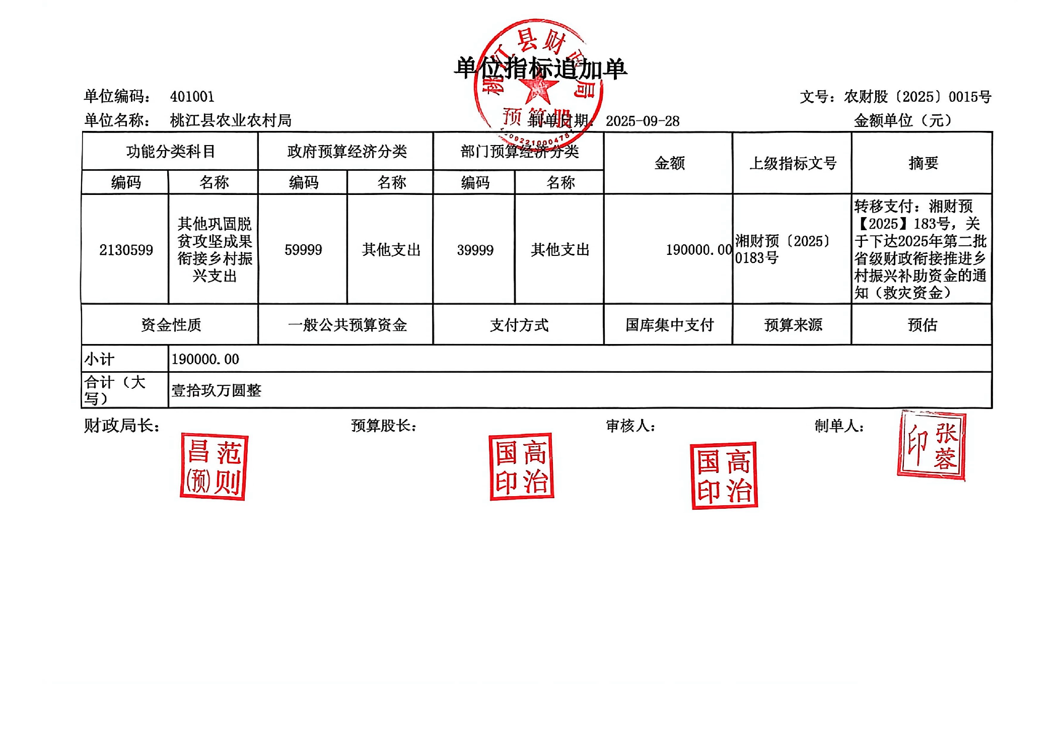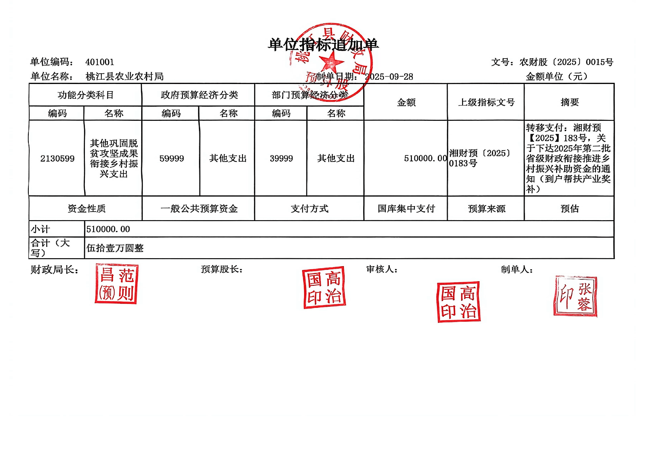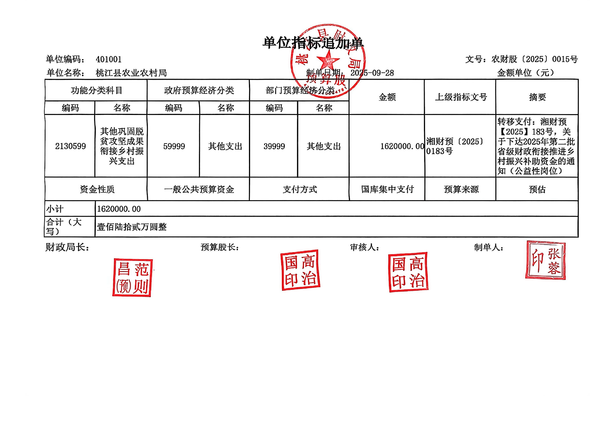 根据桃江县财政局农财股〔2025〕0015号文件精神,现将湘财预[2025]183号979万元,2025年省级第二批财政衔接推进乡村振兴补助资金下达指标单进行公示。