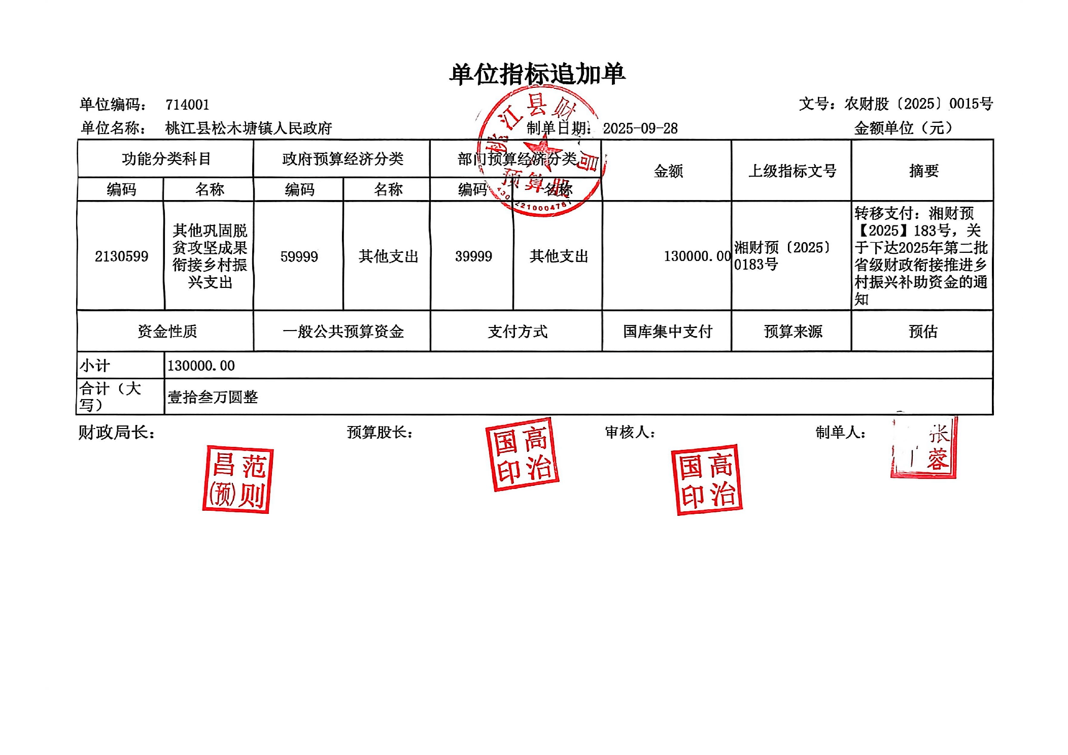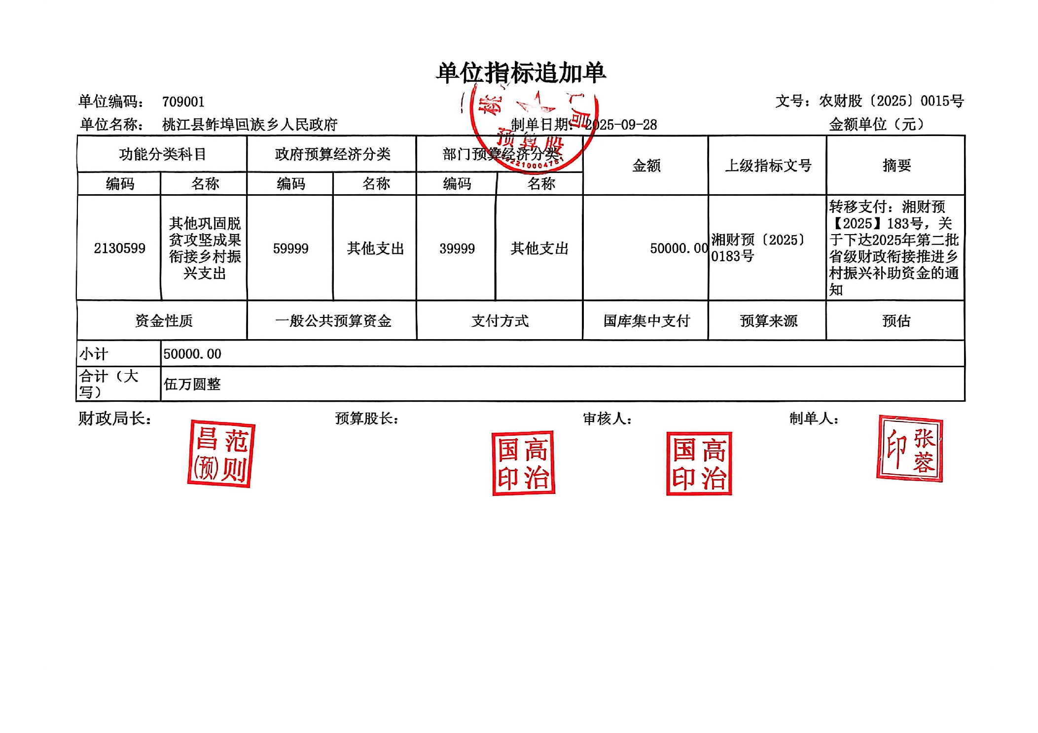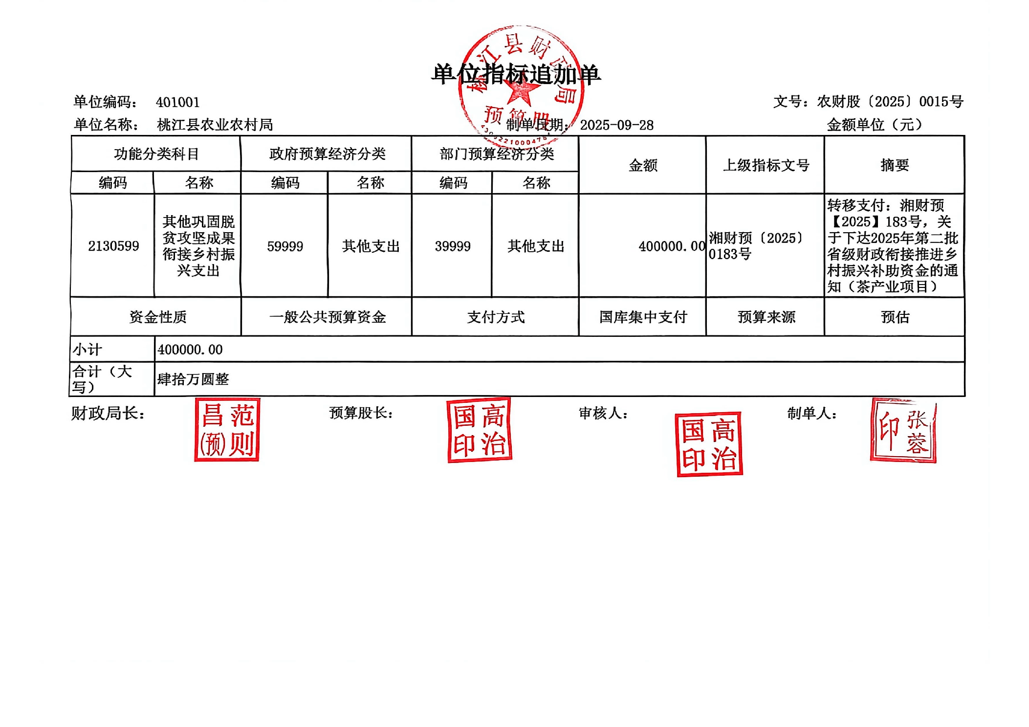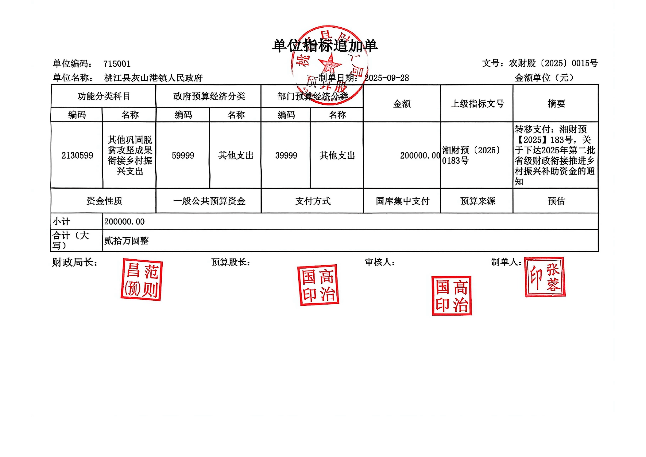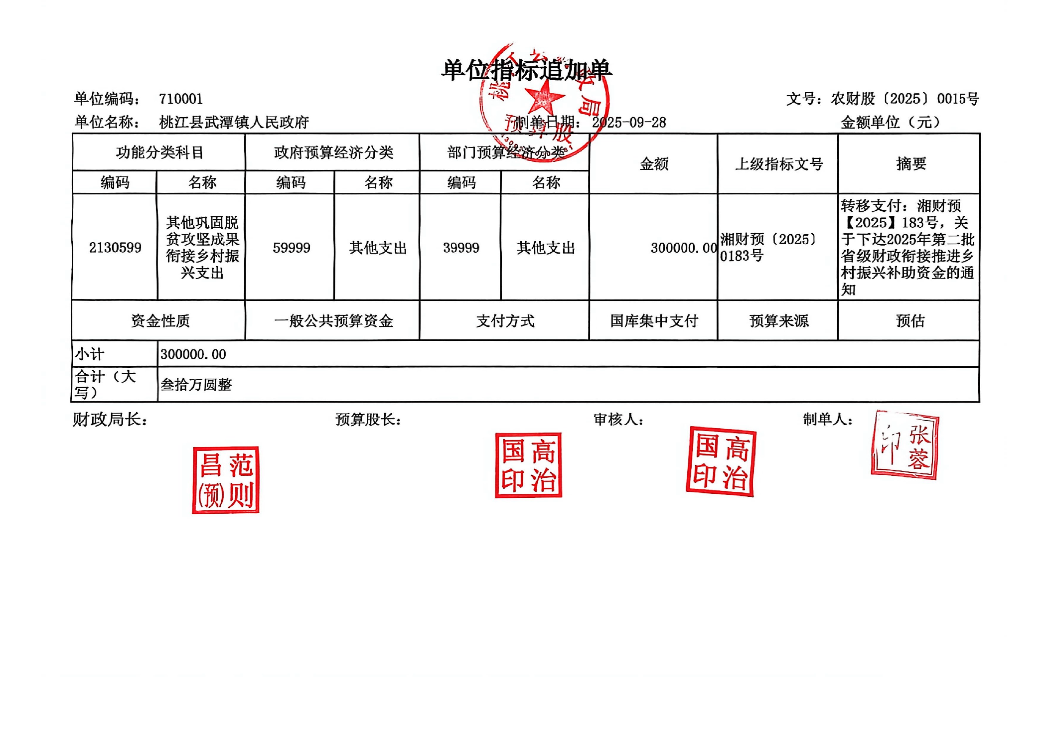 根据桃江县财政局农财股〔2025〕0015号文件精神,现将湘财预[2025]183号979万元,2025年省级第二批财政衔接推进乡村振兴补助资金下达指标单进行公示。