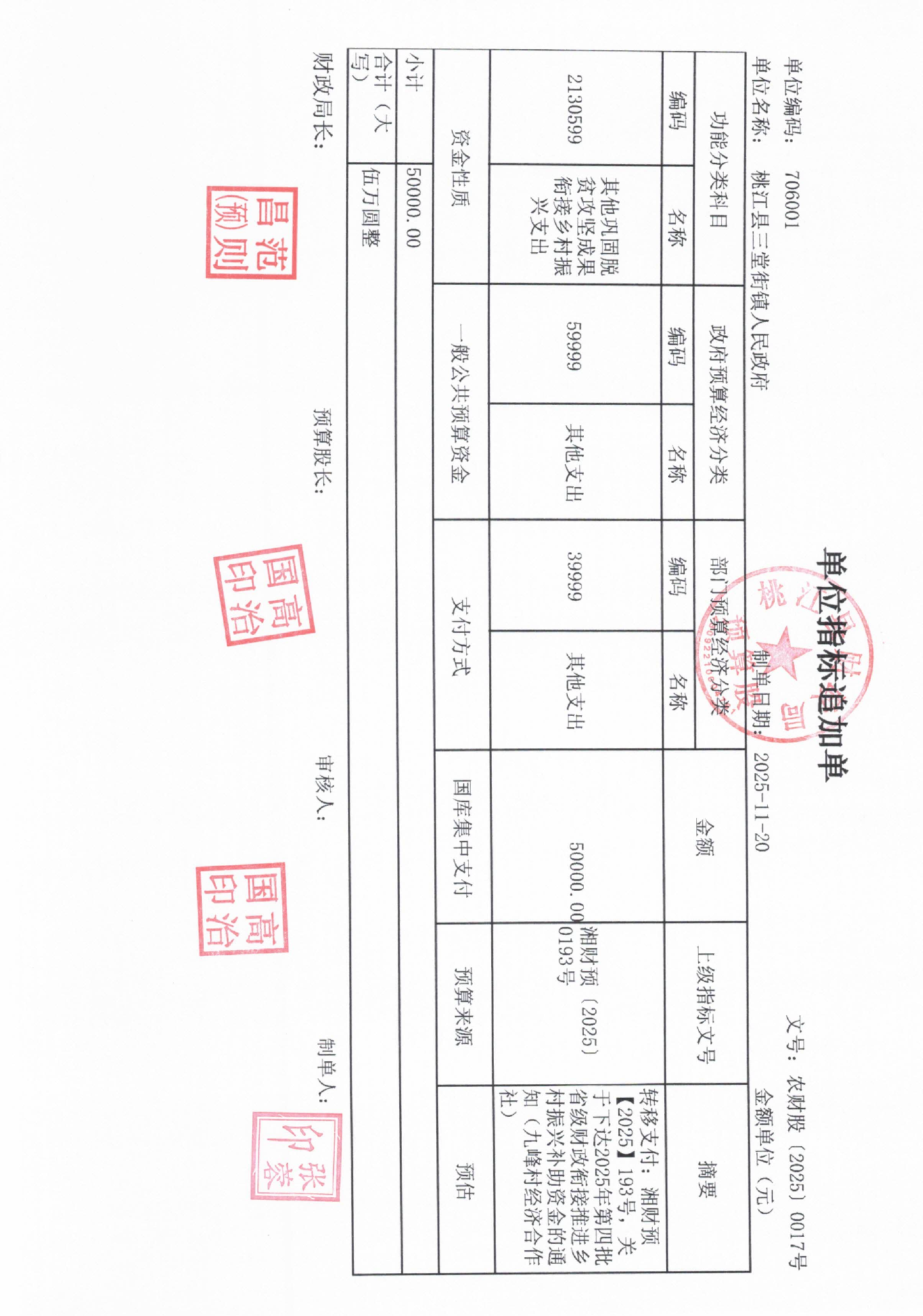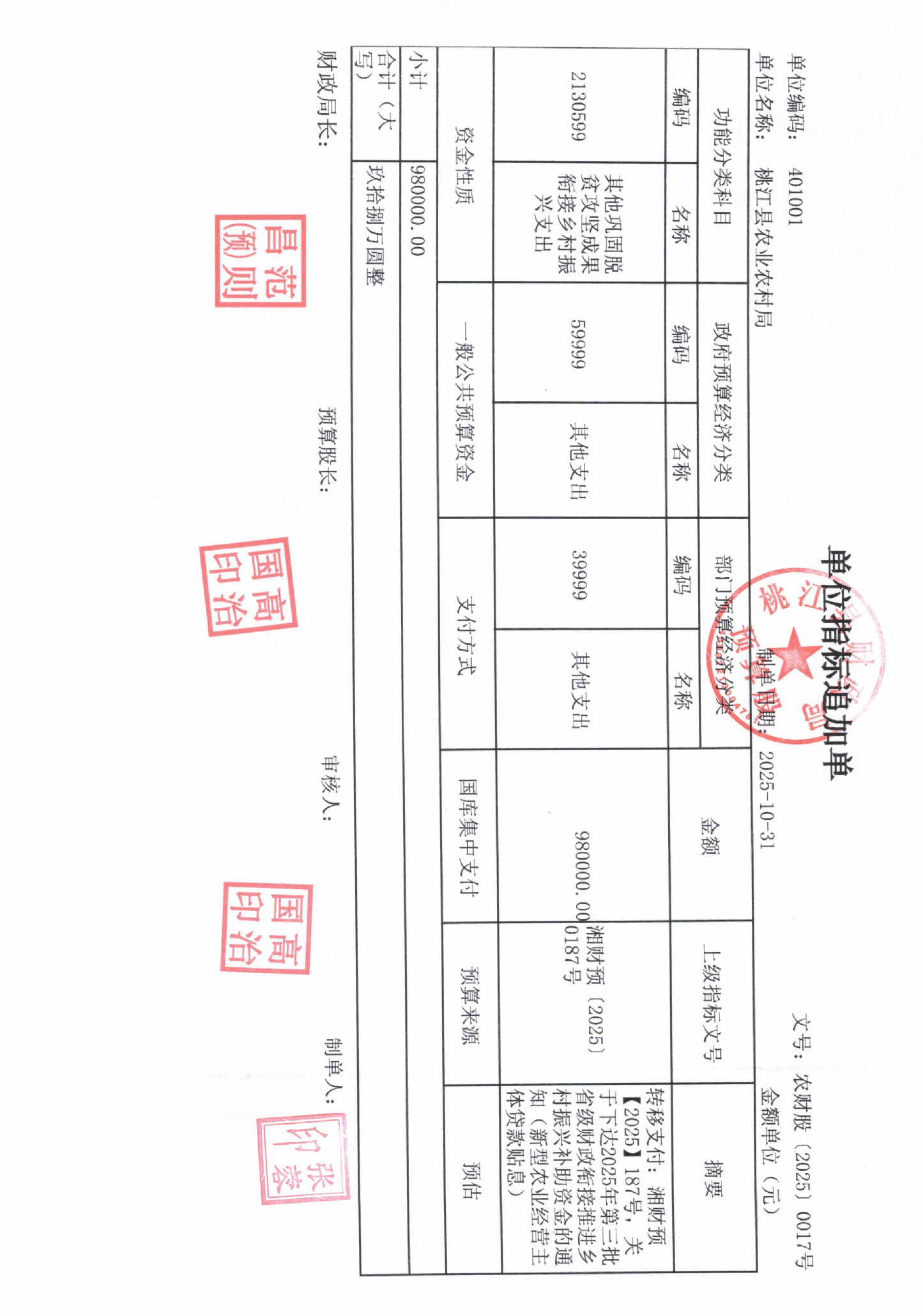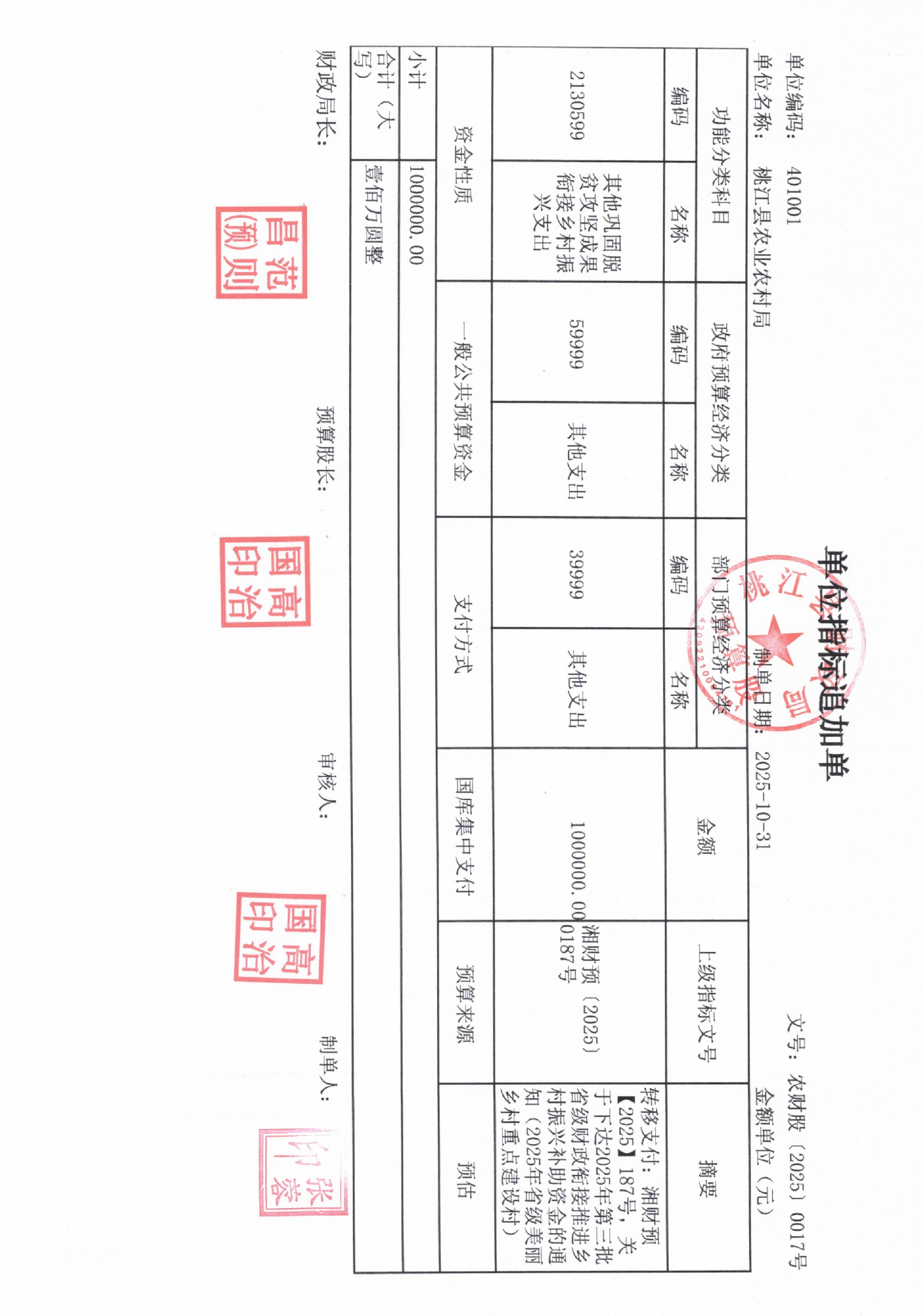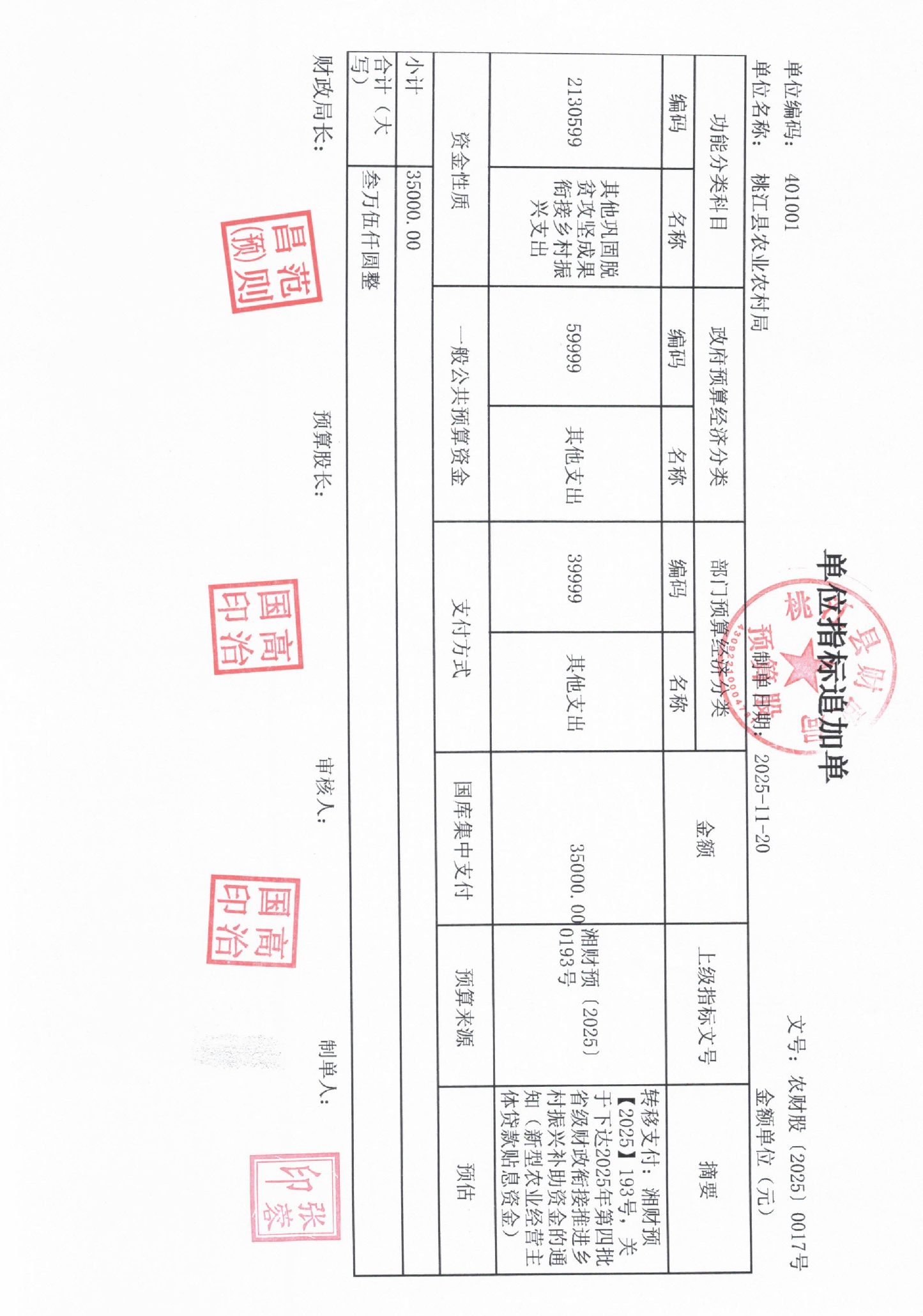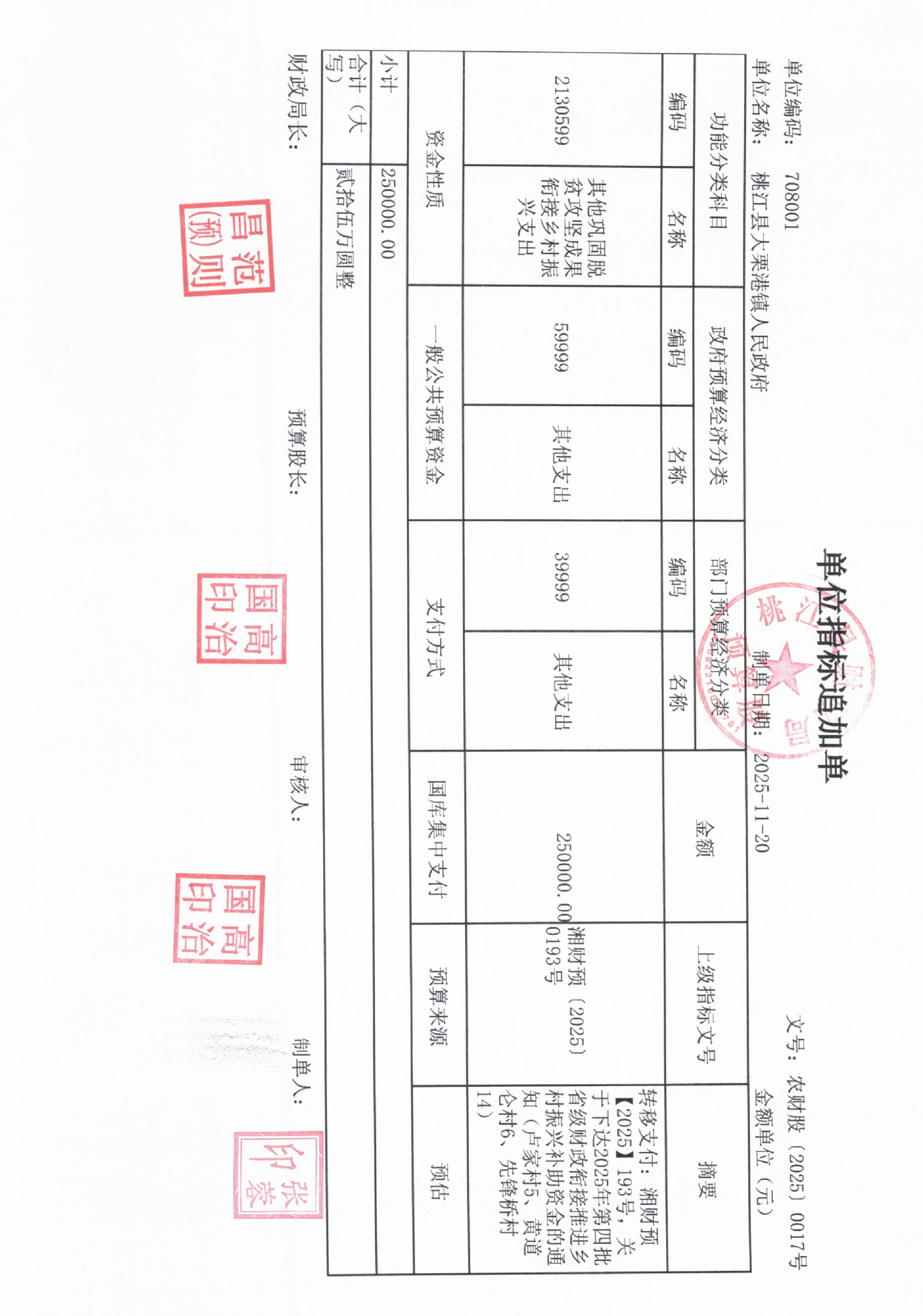 根据桃江县财政局农财股〔2025〕0017号文件精神,现将湘财预[2025]187号442万元,2025年省级第三批财政衔接推进乡村振兴补助资金下达指标单和湘财预[2025]193号467万元,2025年省级第四批财政衔接推进乡村振兴补助资金下达指标单进行公示。