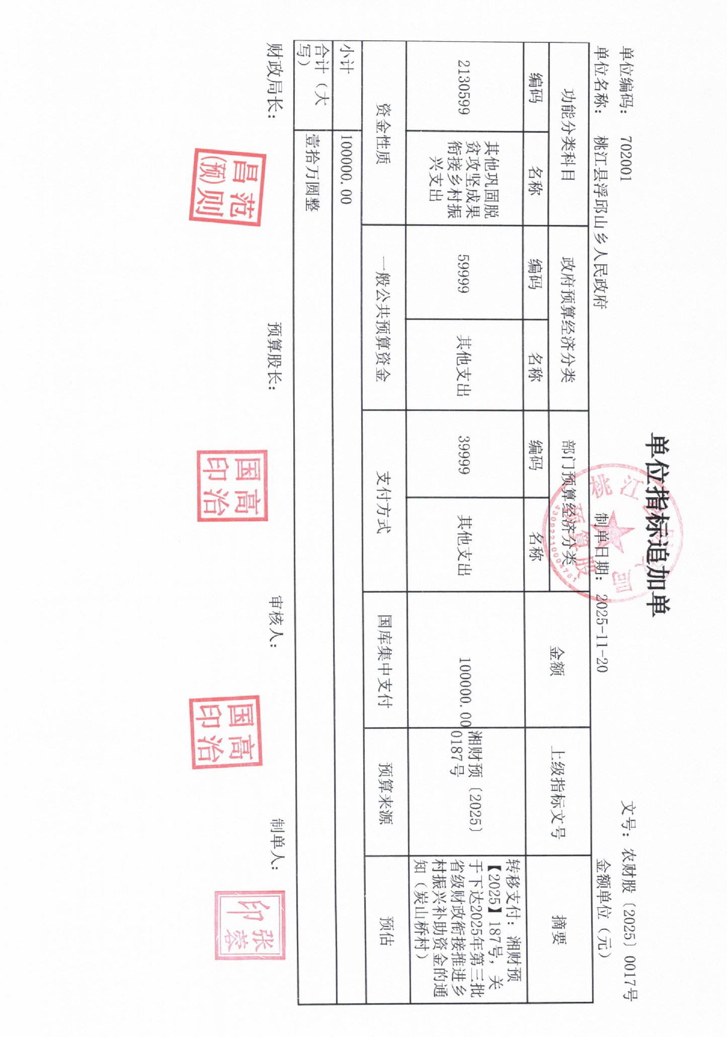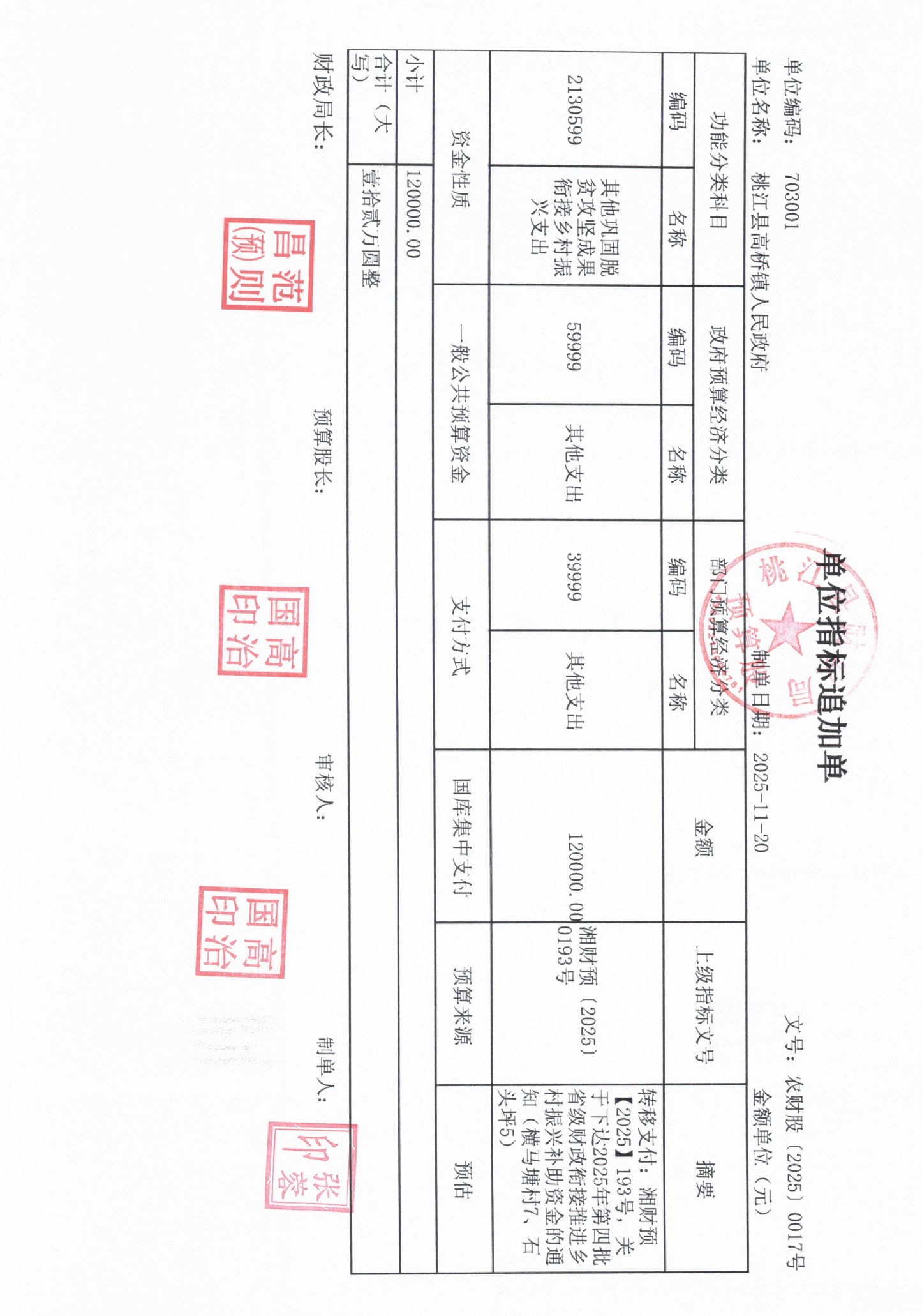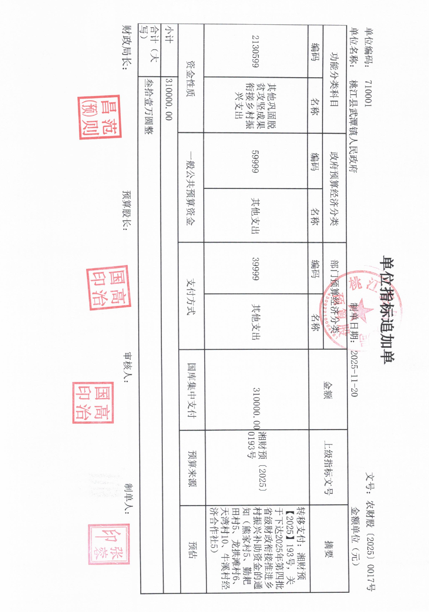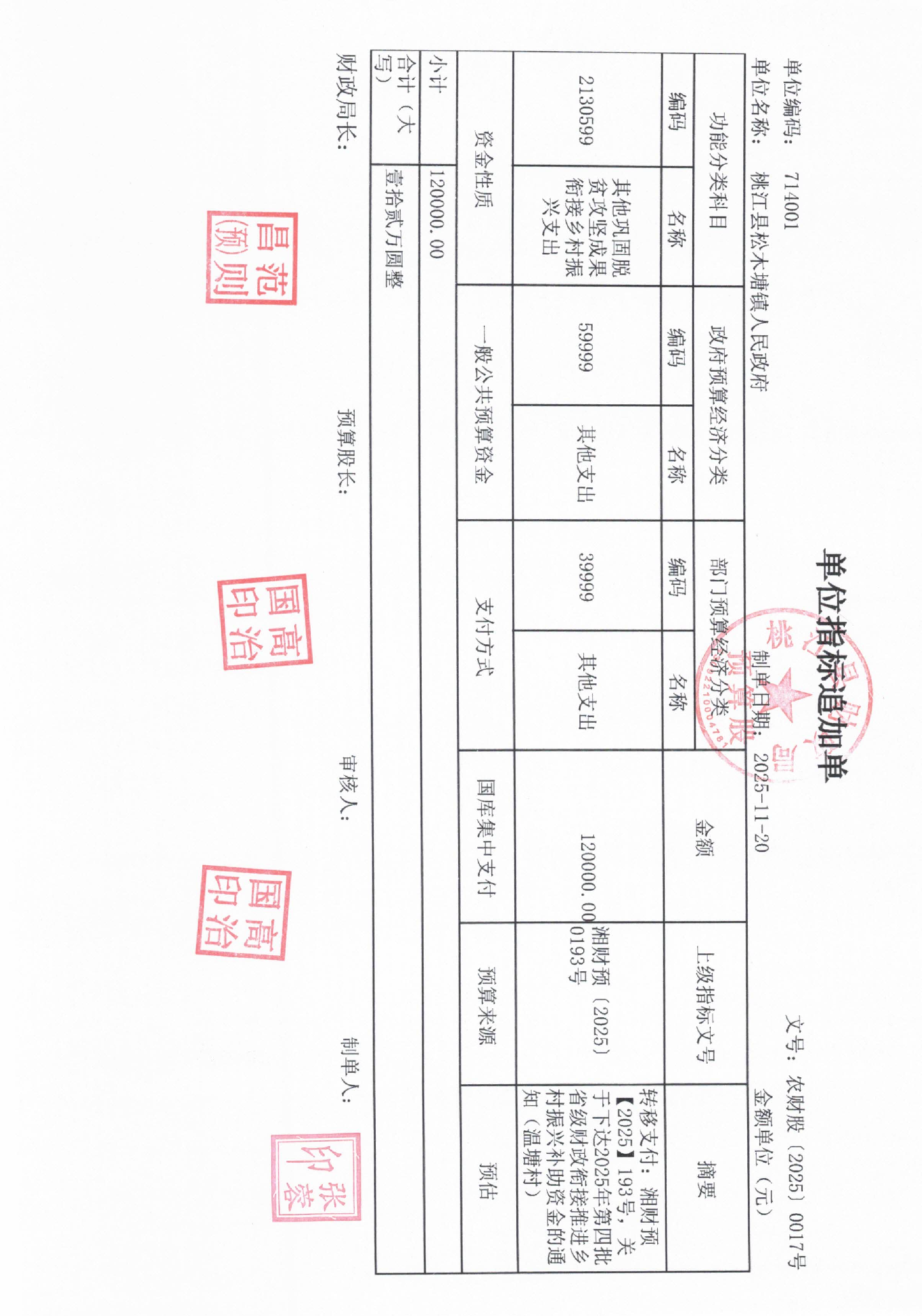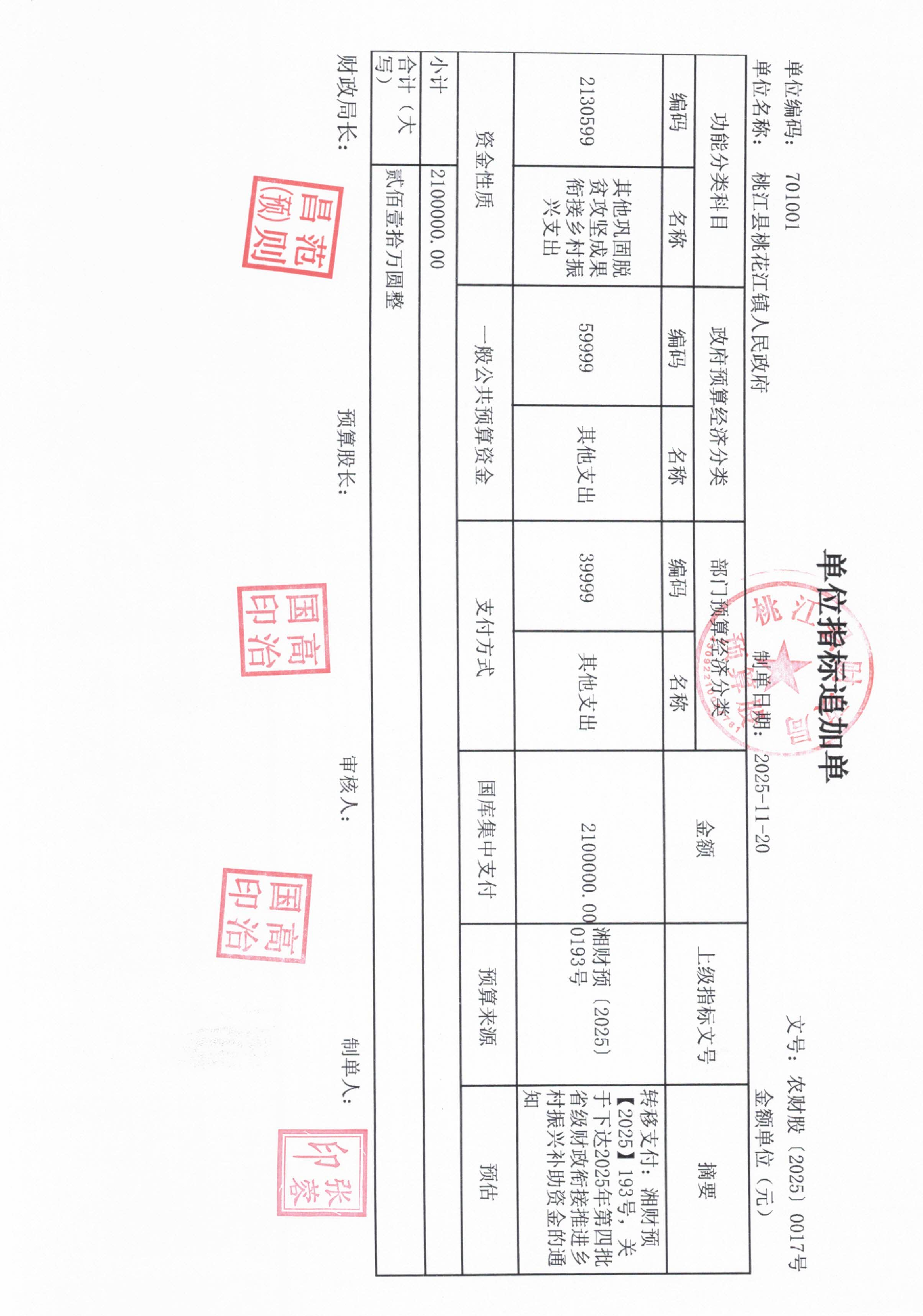 根据桃江县财政局农财股〔2025〕0017号文件精神,现将湘财预[2025]187号442万元,2025年省级第三批财政衔接推进乡村振兴补助资金下达指标单和湘财预[2025]193号467万元,2025年省级第四批财政衔接推进乡村振兴补助资金下达指标单进行公示。