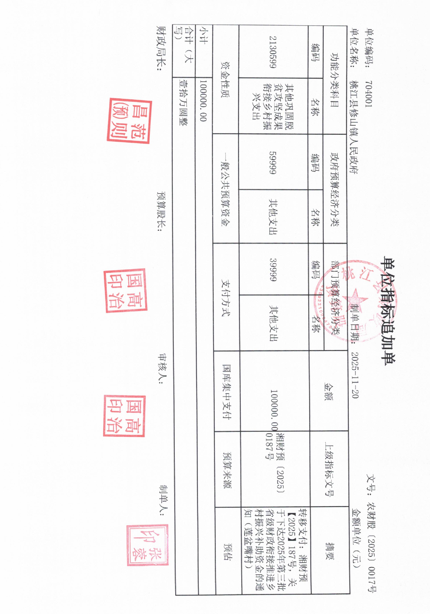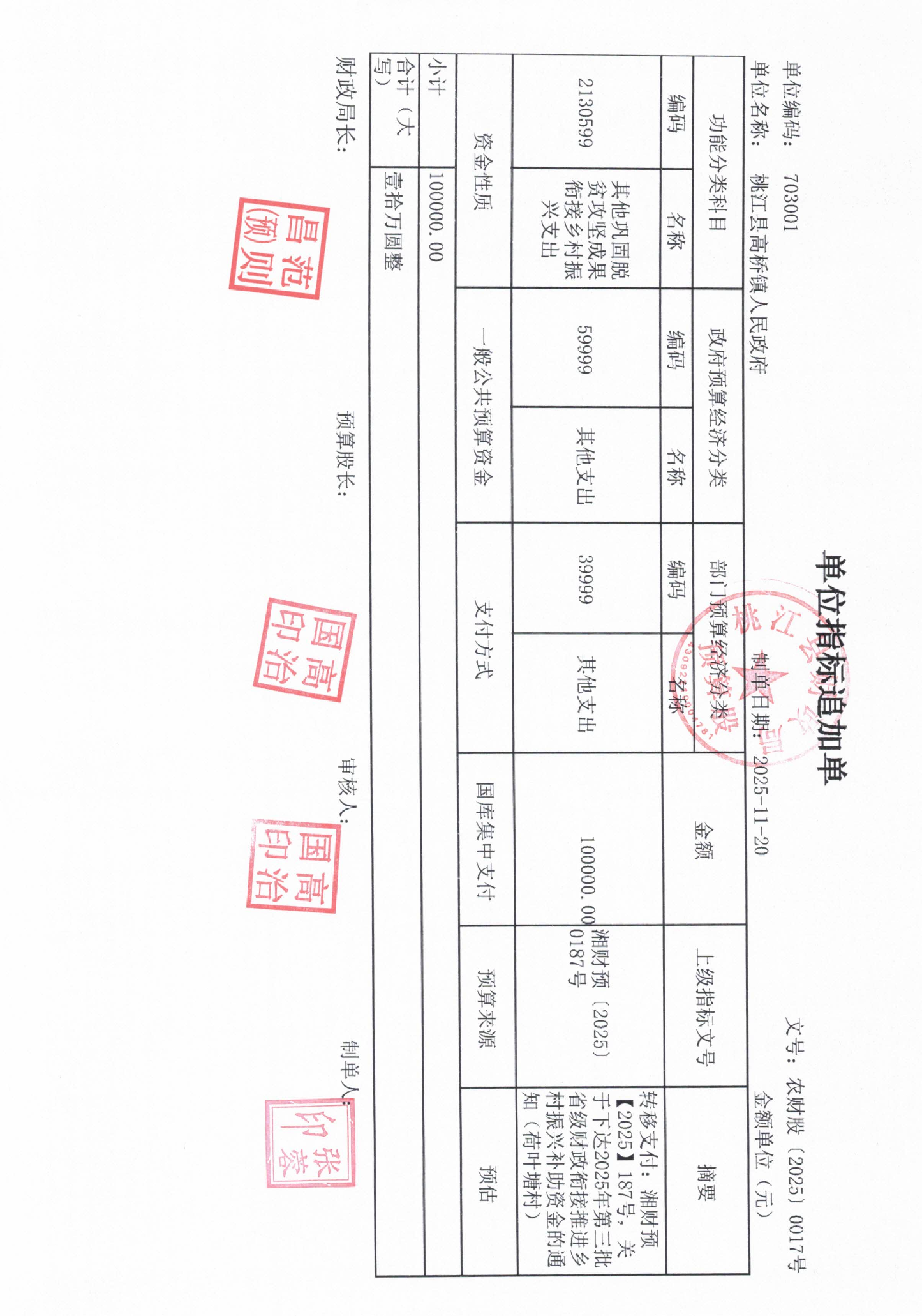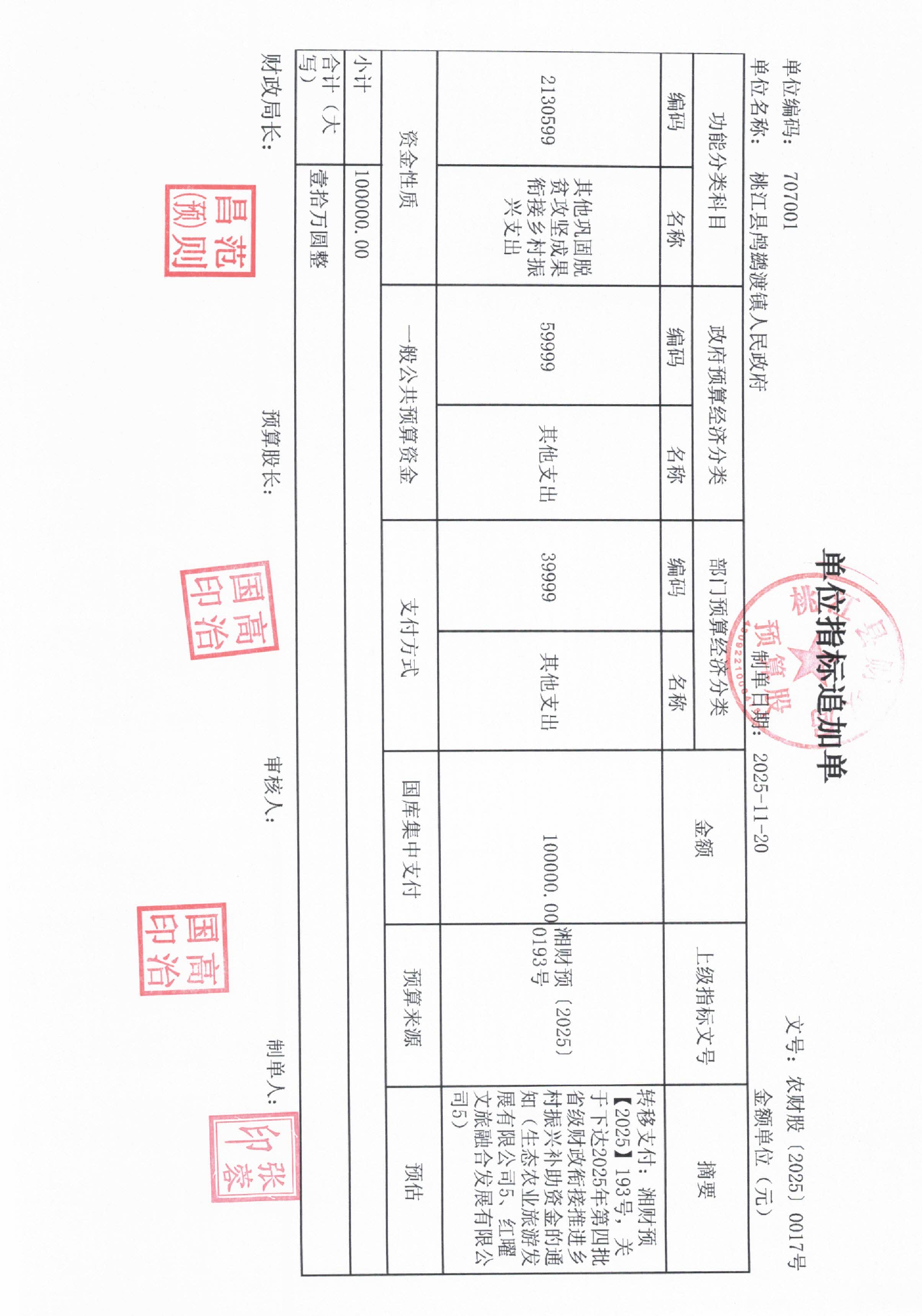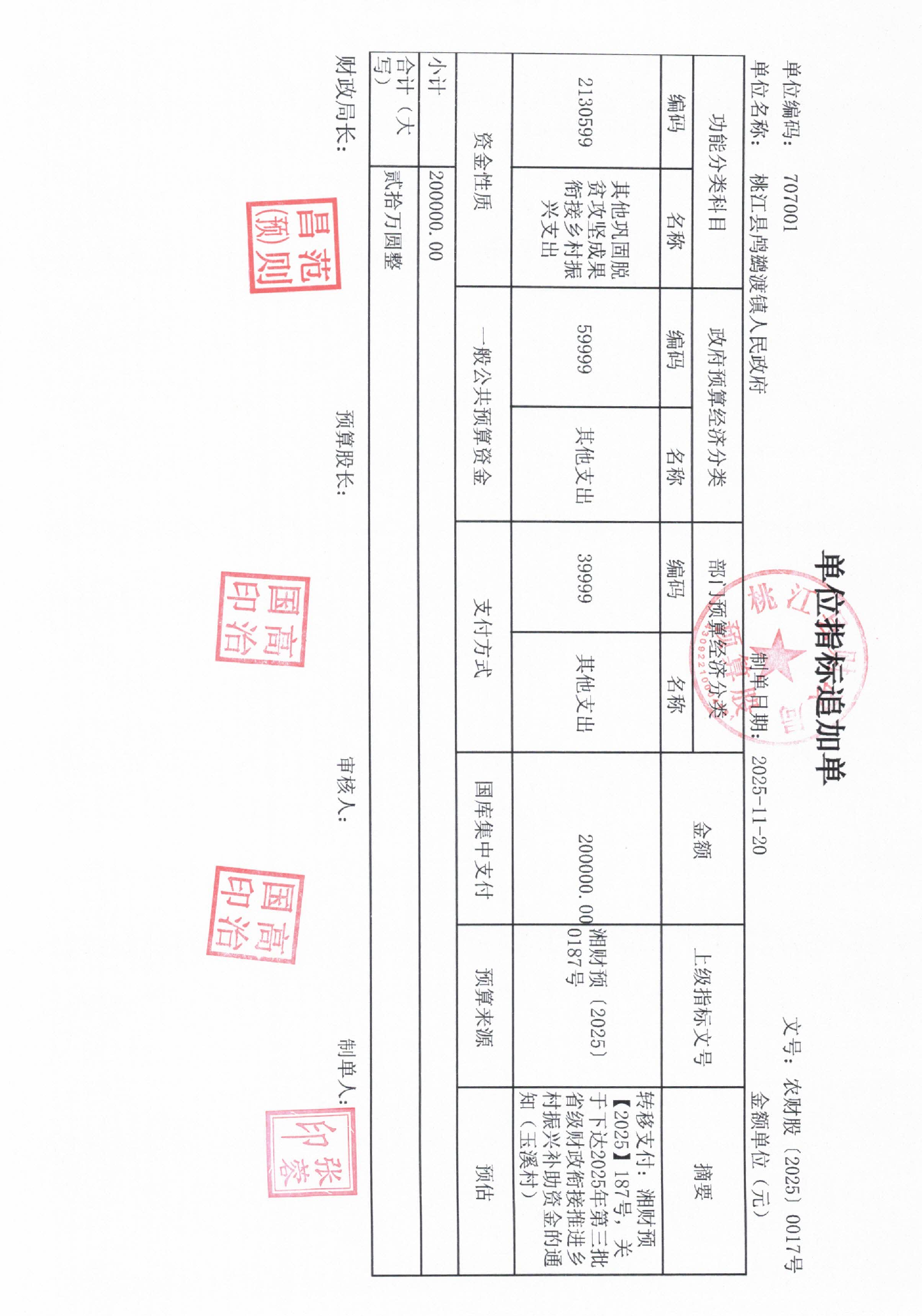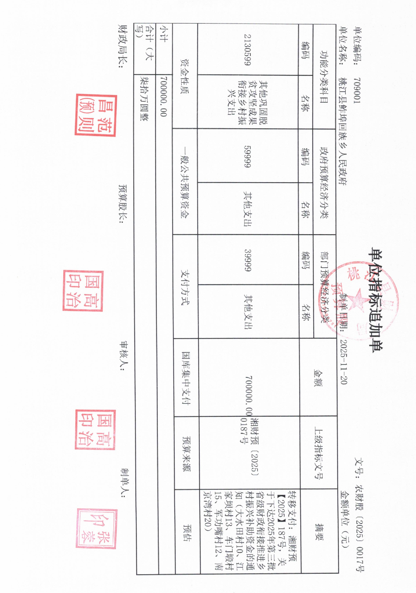 根据桃江县财政局农财股〔2025〕0017号文件精神,现将湘财预[2025]187号442万元,2025年省级第三批财政衔接推进乡村振兴补助资金下达指标单和湘财预[2025]193号467万元,2025年省级第四批财政衔接推进乡村振兴补助资金下达指标单进行公示。