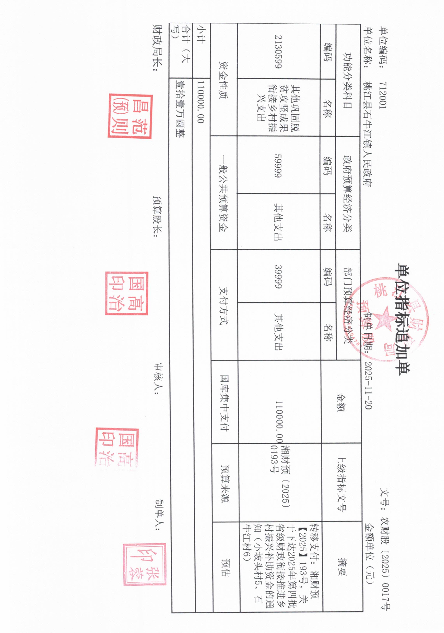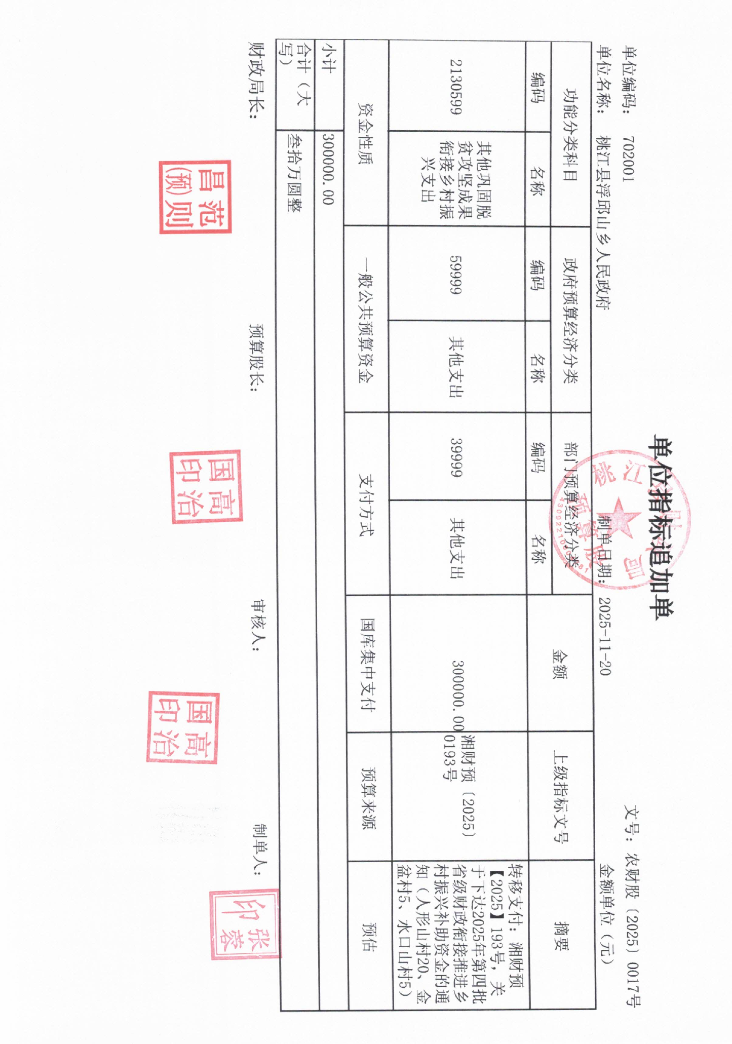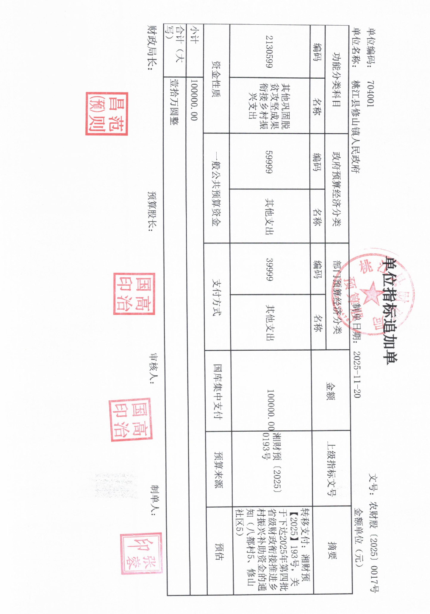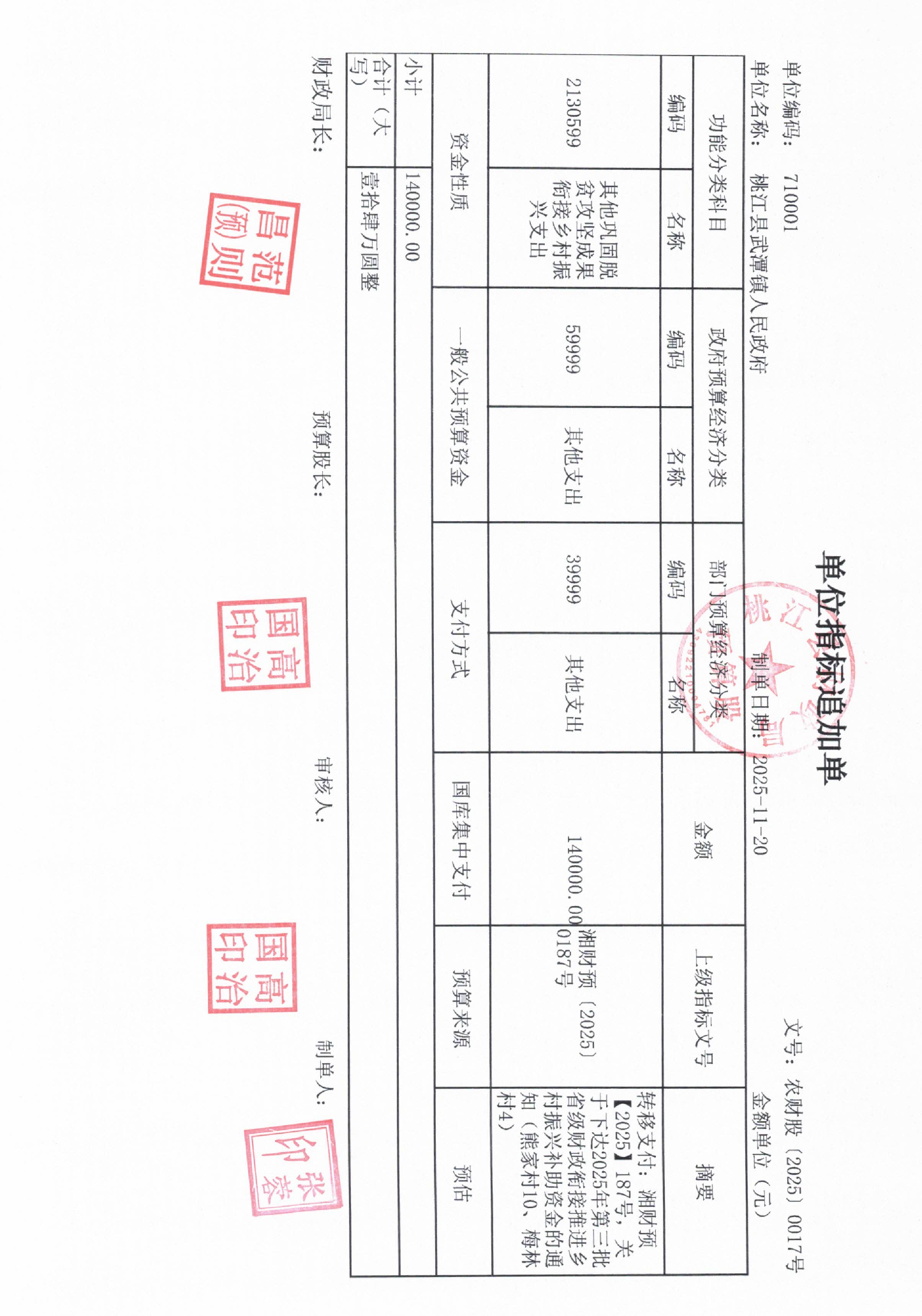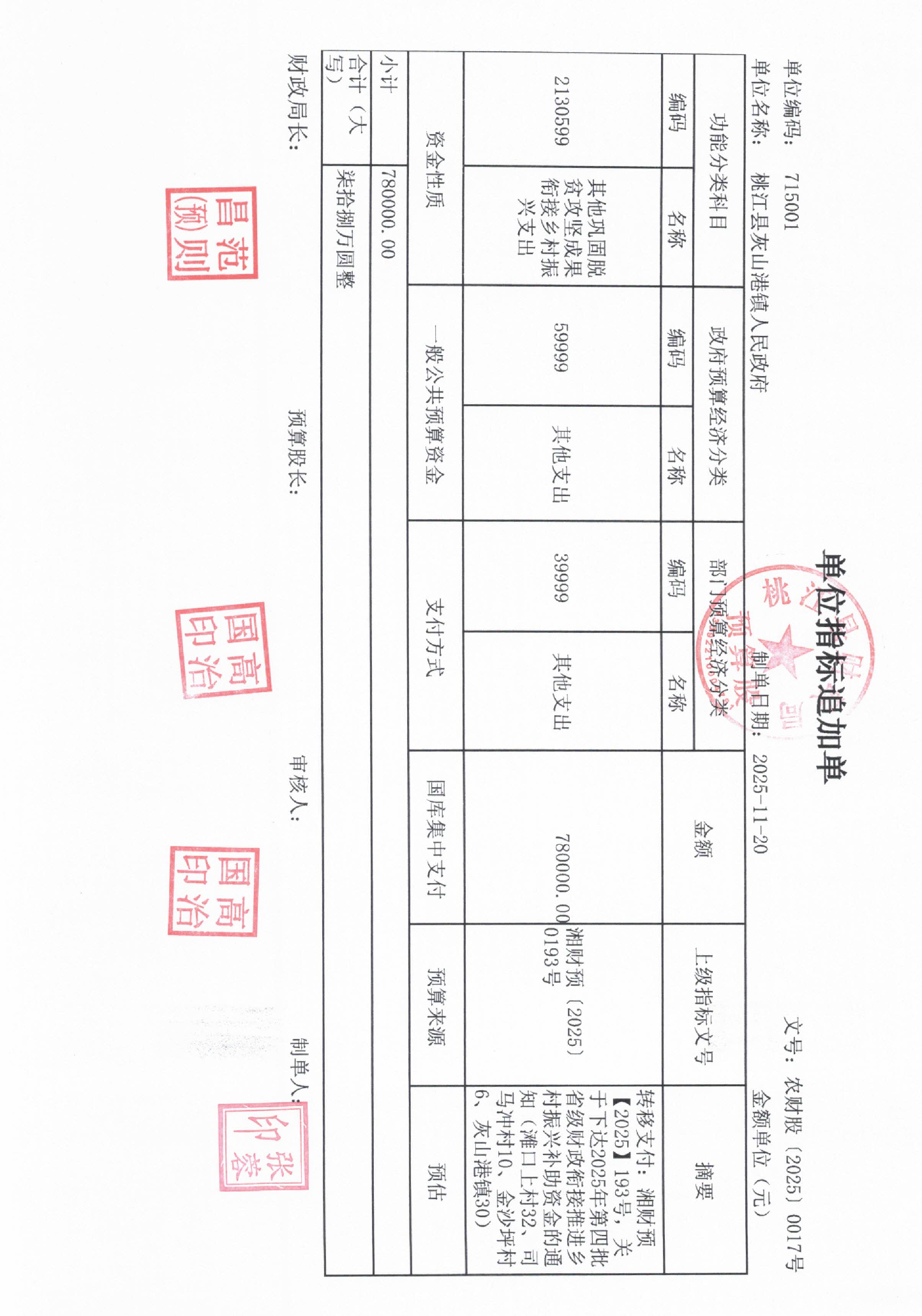 根据桃江县财政局农财股〔2025〕0017号文件精神,现将湘财预[2025]187号442万元,2025年省级第三批财政衔接推进乡村振兴补助资金下达指标单和湘财预[2025]193号467万元,2025年省级第四批财政衔接推进乡村振兴补助资金下达指标单进行公示。