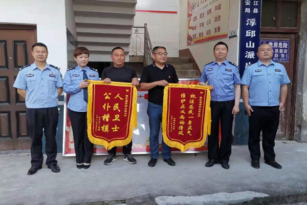 5月8日下午,桃江县浮邱山中心学校与居民吴先生来到县公安局浮邱山派出所,双双为民警送上锦旗,感谢民警伸张正义,让违法犯罪分子受到应有惩罚。