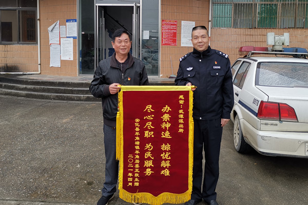 4月26日,家住安化县羊角塘镇的王先生专程赶到桃江县公安局武潭派出所,为民警送上鲜红锦旗。